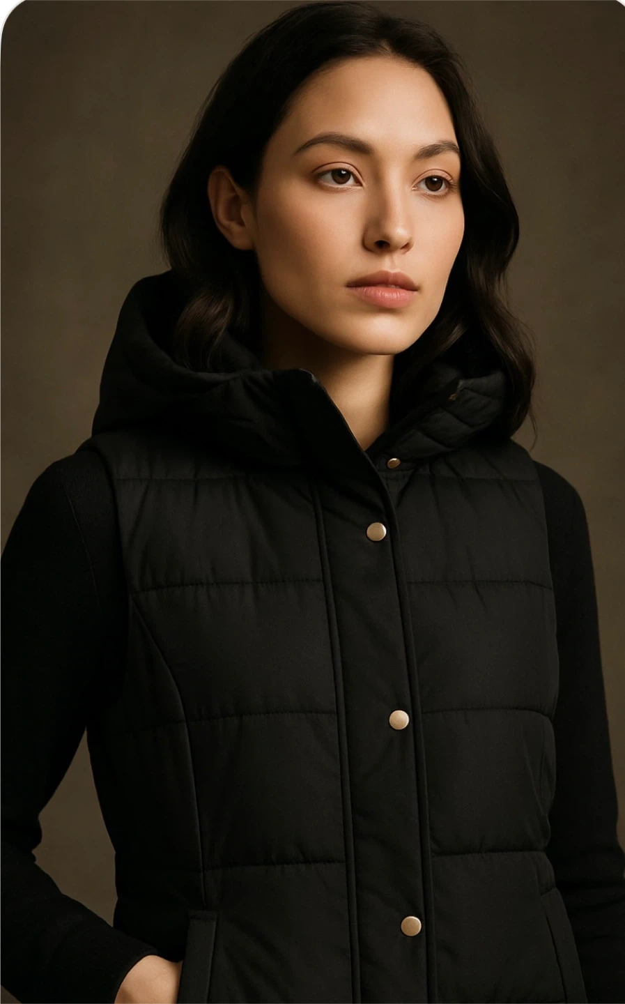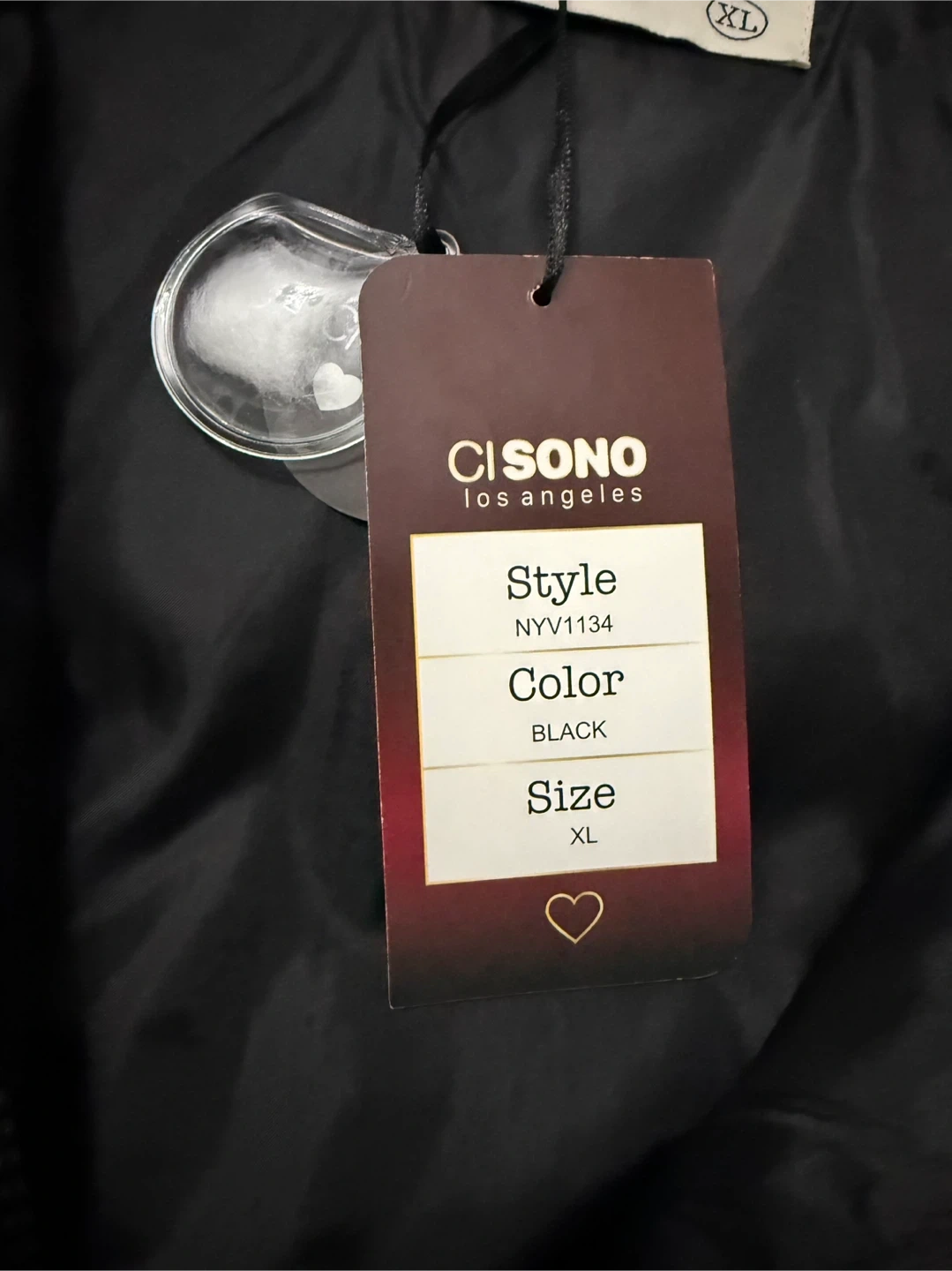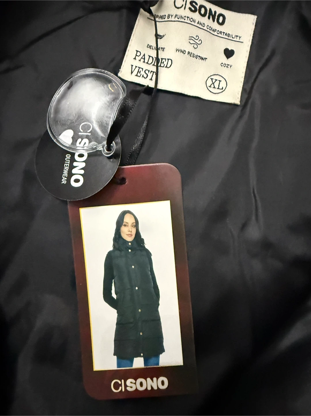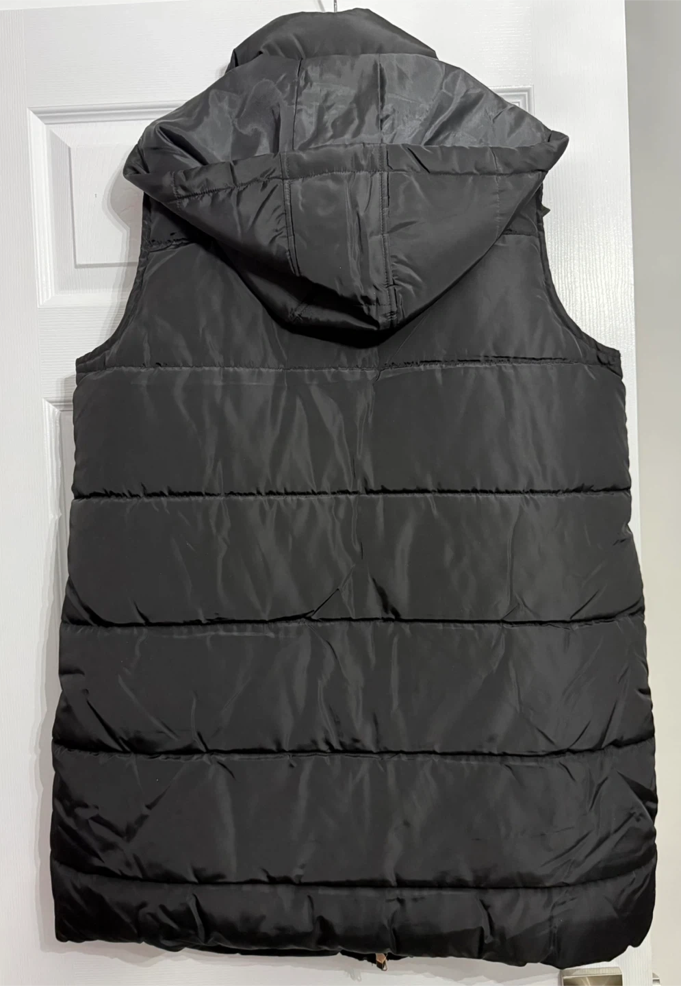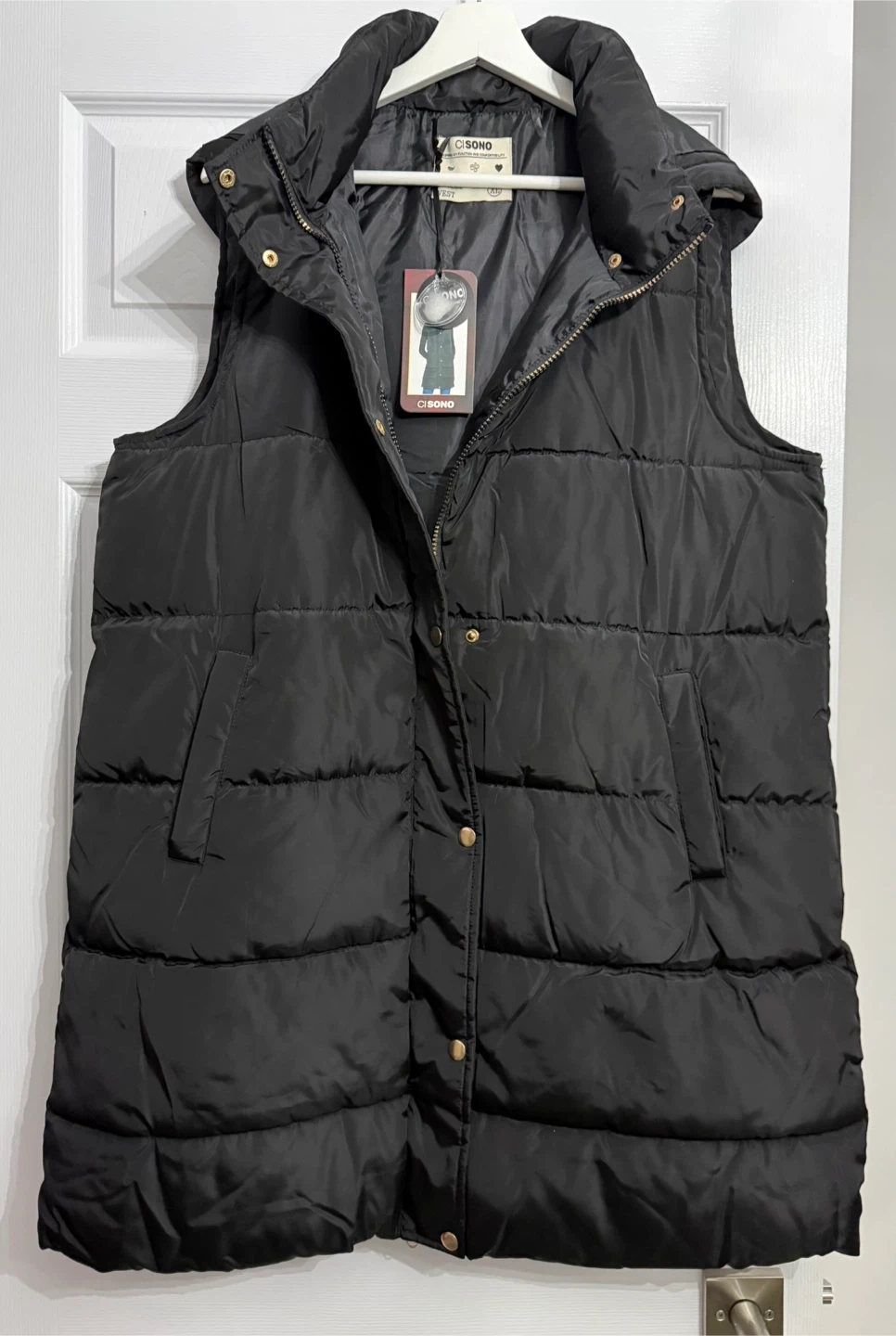 This black puffer vest from Ci Sono is a great layering piece. It features a full zip front with snap closures and two front pockets. The vest has a cozy hood for extra warmth. Perfect for cooler fall or spring days! Size XL. New with tags