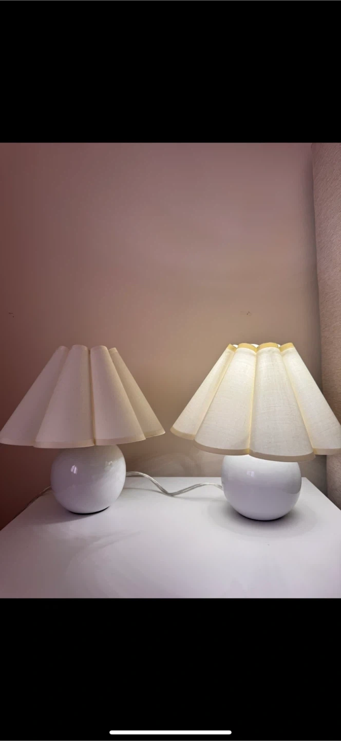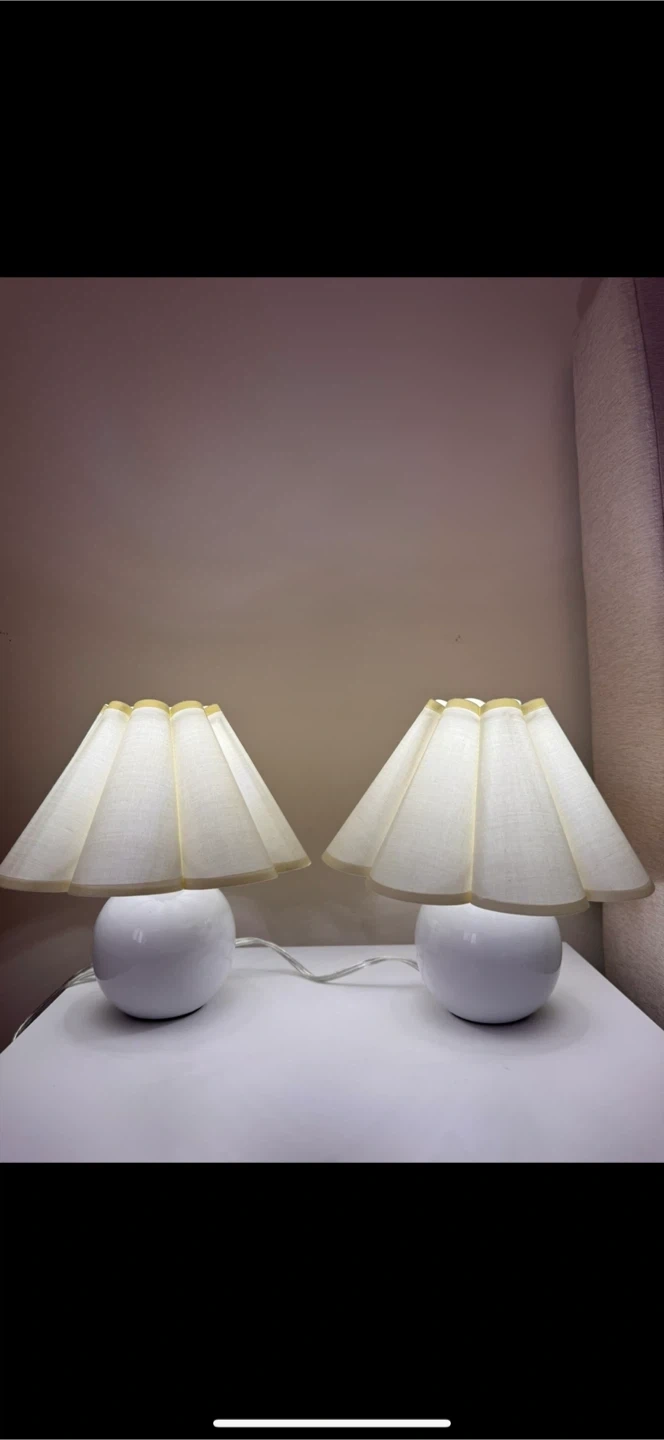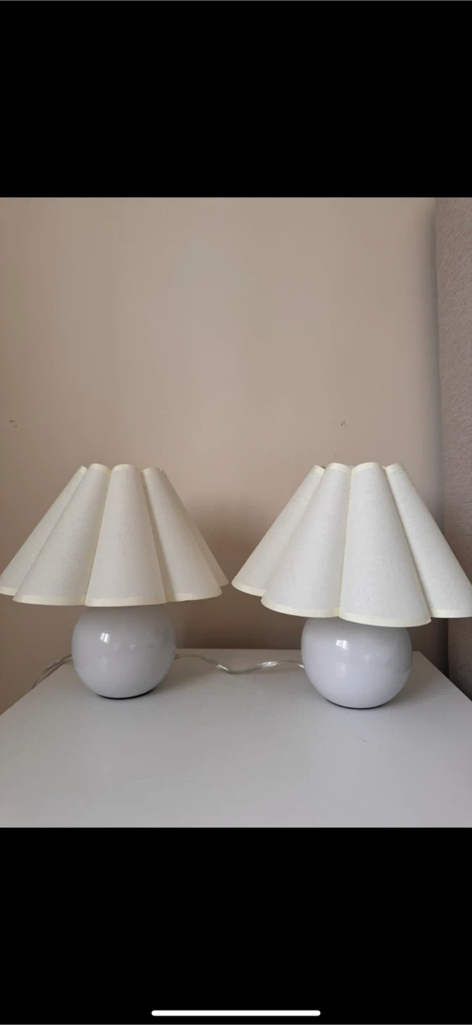 Two matching creamy bedside lamps with pleated cream-coloured shades. These lamps have a globe-shaped ceramic base and a simple on/off switch.Adds a soft ambiance to any room.