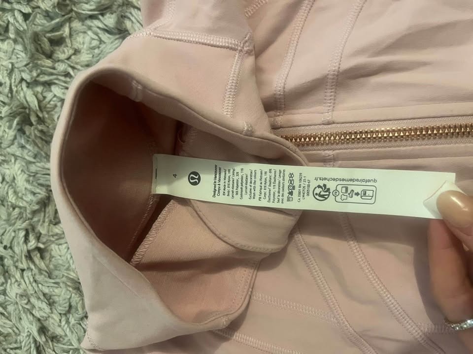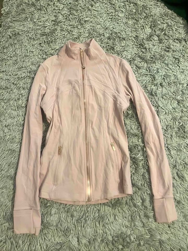 Lululemon Define Jacket in a soft blush pink. Full-zip, fitted silhouette with thumb holes and zip pockets. Super flattering and perfect for workouts or everyday wear. Well cared for, clean, and in great condition.