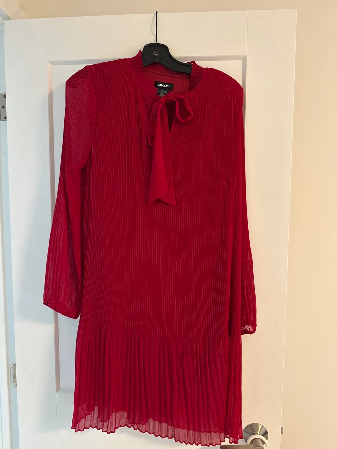 This DKNY dress is a vibrant red with stylish pleats all over. It features long sleeves and a fashionable bow tie at the neck. Made from lightweight chiffon material, it's perfect for a night out!