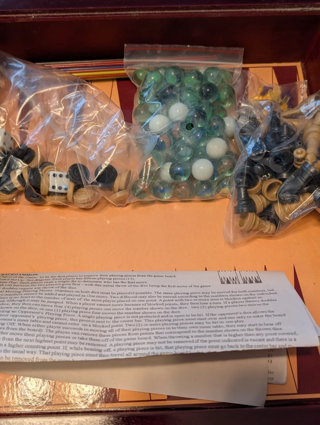 This wooden game board offers three classic games: chess, checkers, and Chinese checkers. It includes all the marbles and pieces needed for Chinese checkers, along with dice and checker pieces. The board measures approximately 14 inches square.