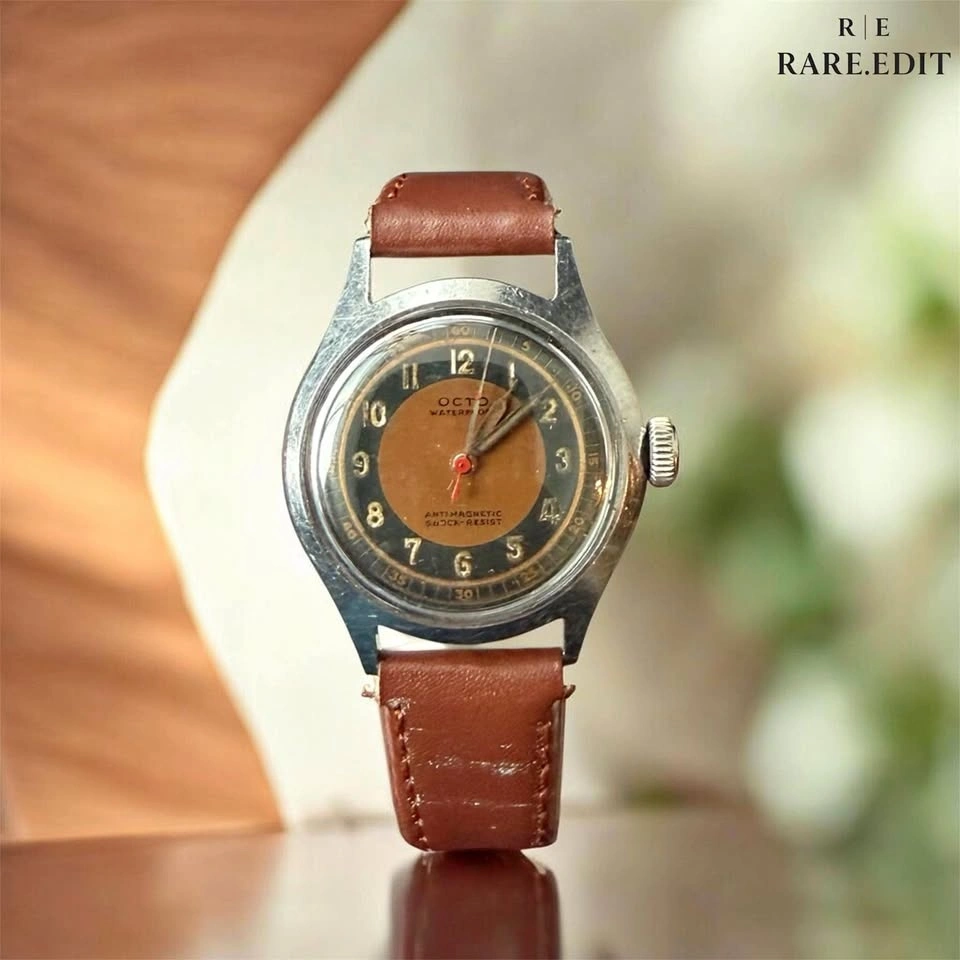 Octo automatic with a warm brown dial, contrasting black chapter ring, and classic Arabic numerals, finished with a subtle red seconds hand. Stainless steel case paired with a brown leather strap. It’s one of my best pieces given its timeless, understated, and full of character. Mechanical movement, keeping good time. Honest vintage wear consistent with age adds to its charm. A refined piece for someone who appreciates classic design and quiet presence.