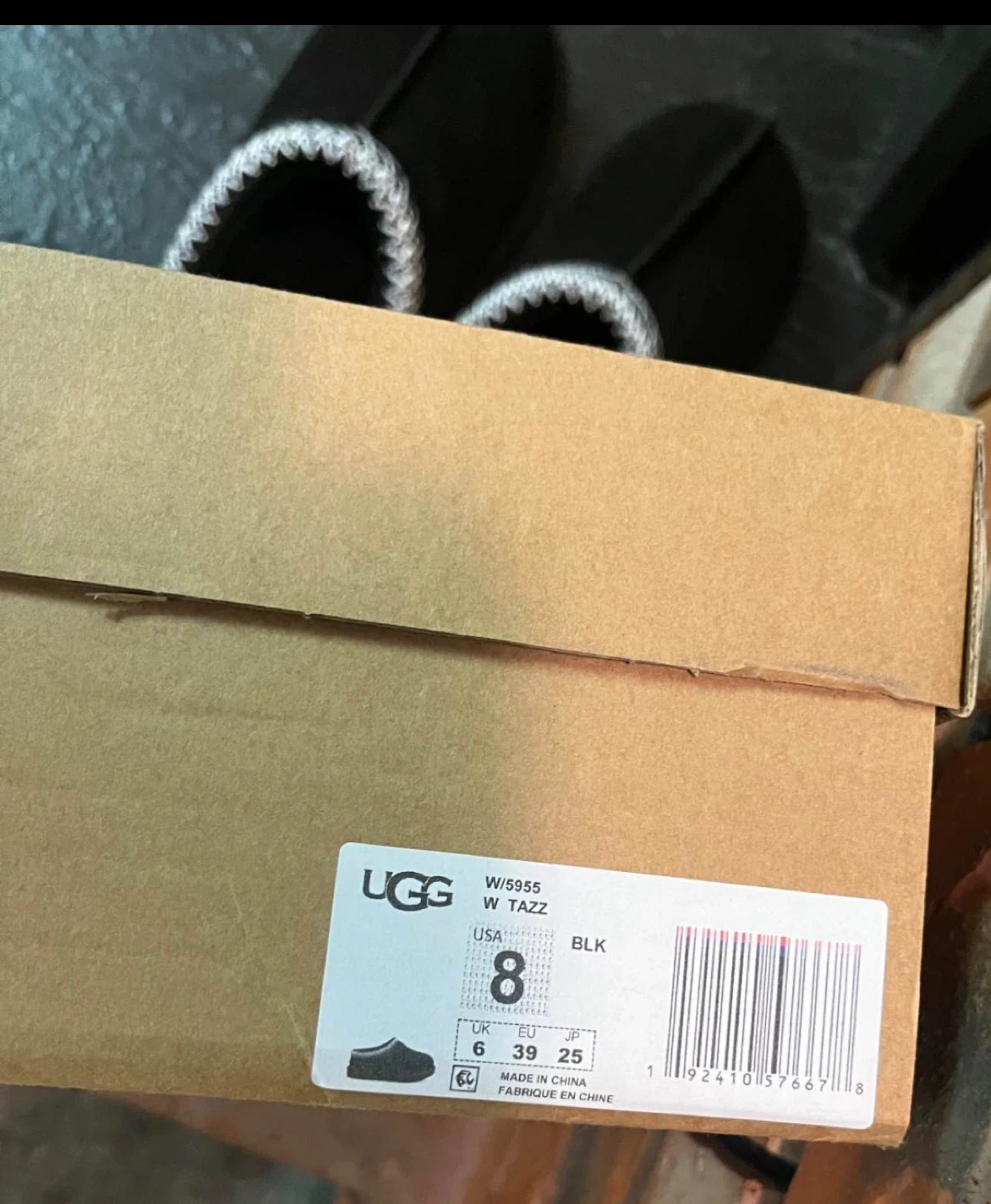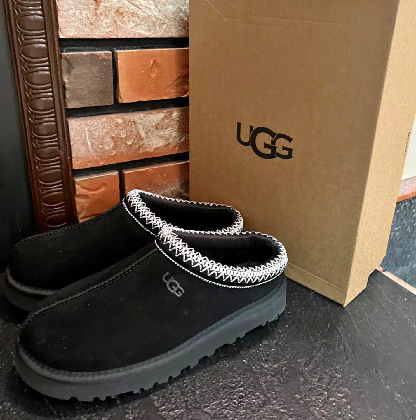 Cozy UGG slippers in black suede. Features a warm shearling lining and a durable rubber sole. Comes with original box.