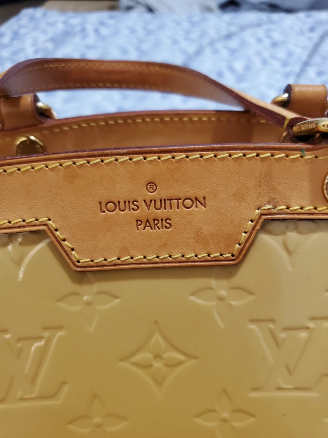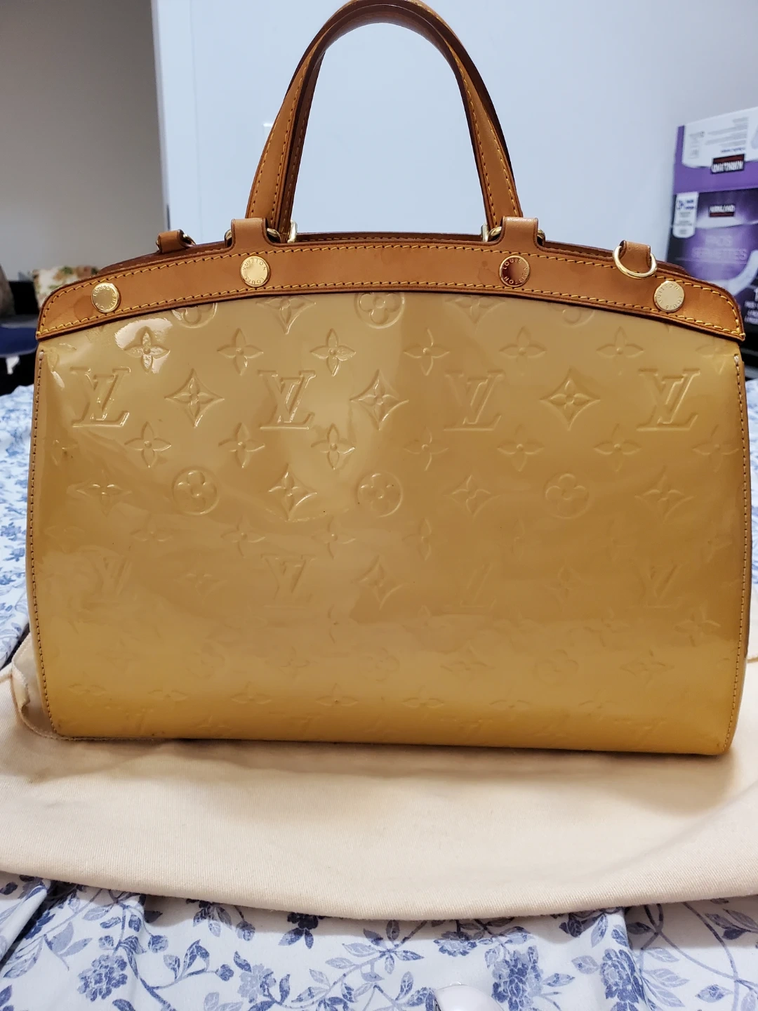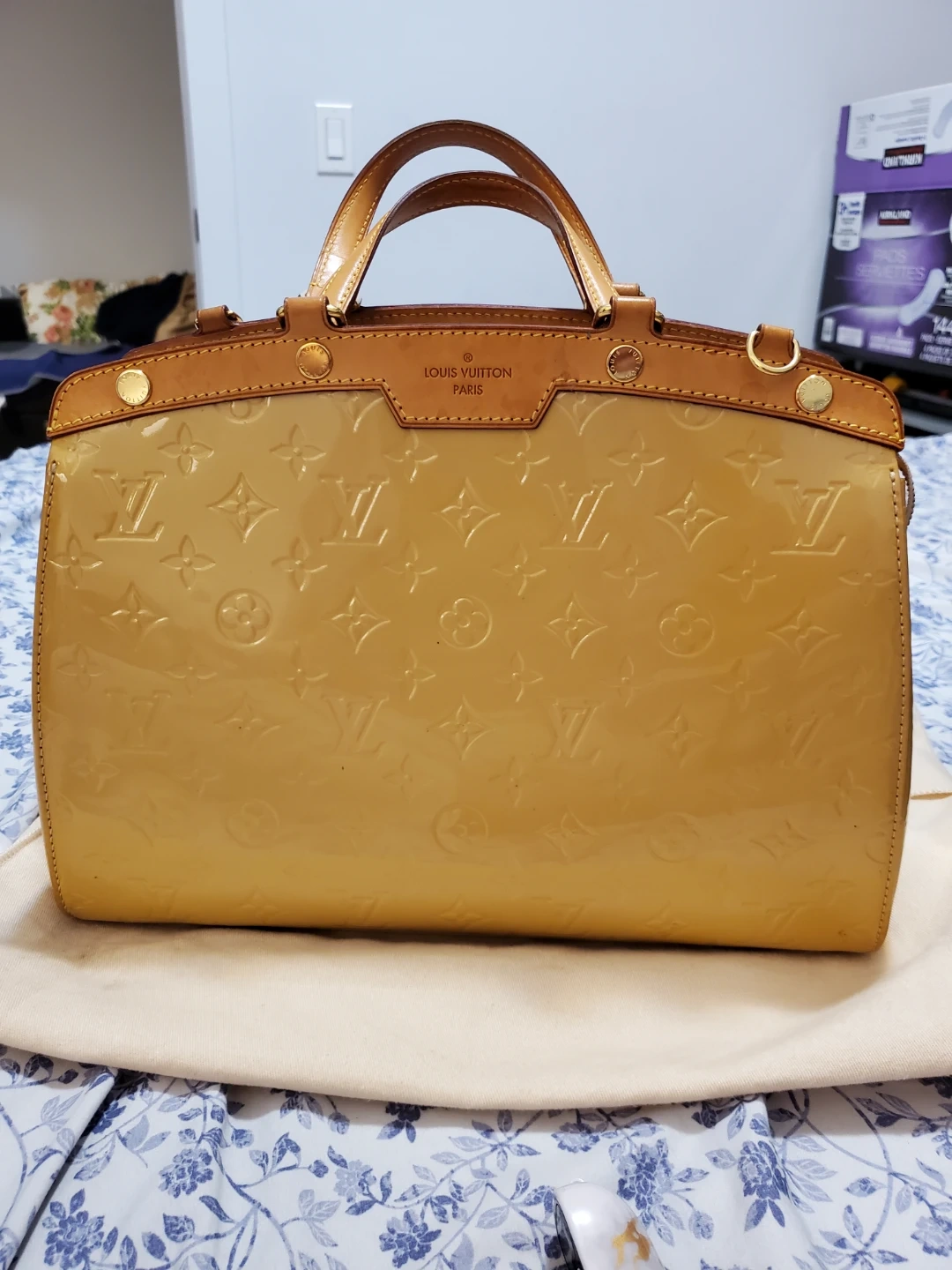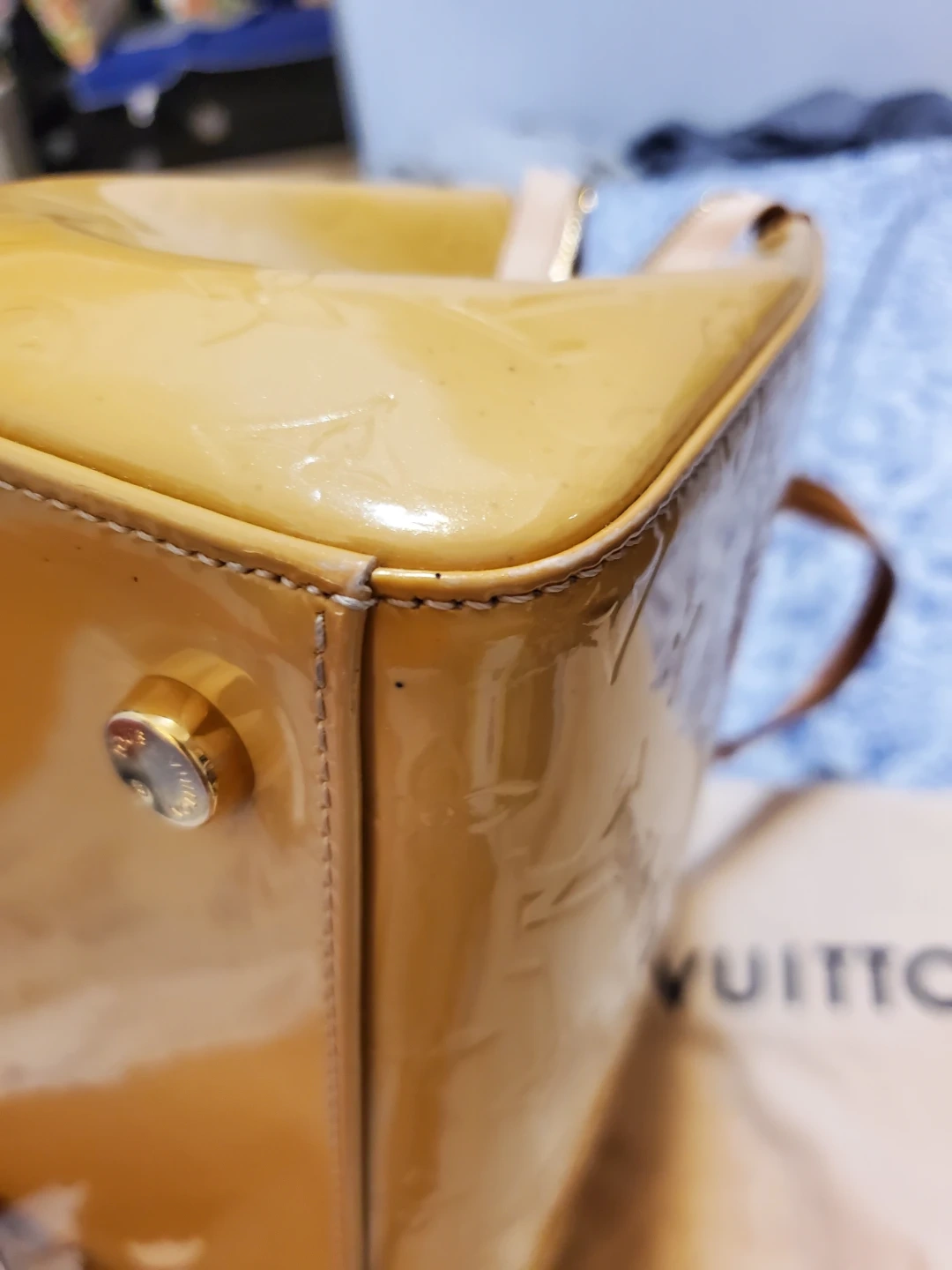 This is a Louis Vuitton Vernis handbag in a light yellow/beige colour. It has a patent leather exterior with the signature LV monogram pattern. The bag features dual top handles and gold-tone hardware. Interior is a neutral beige lining. It's a stylish accessory for everyday use.