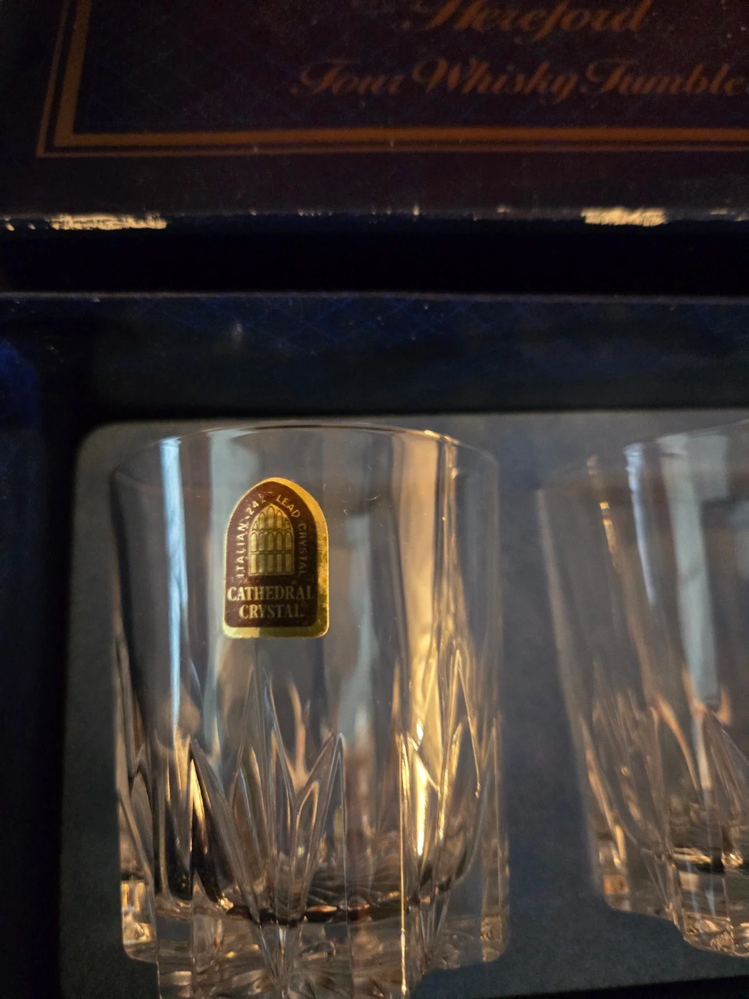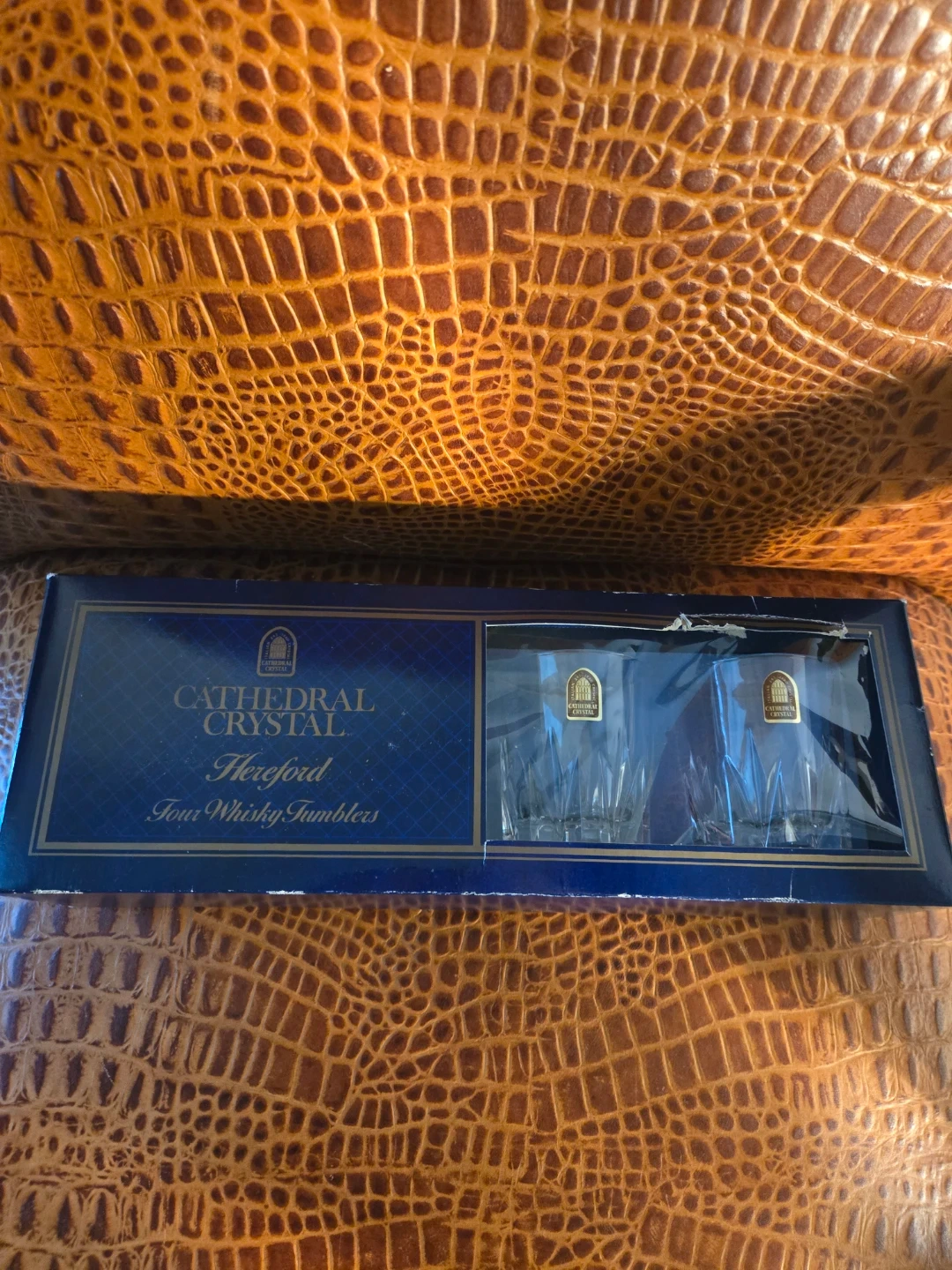 New Set of four Cathedral Crystal Hereford whisky tumblers. Made from 24% lead crystal. Comes in original box. Packaging not perfect.