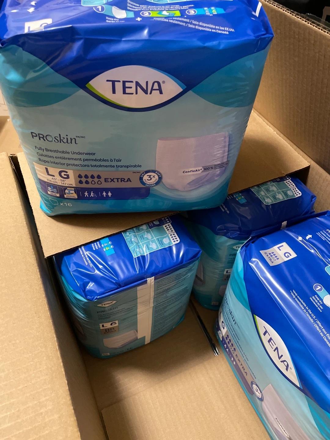 This is a 4-pack of TENA ProSkin Fully Breathable Underwear. It's in size Large (LG) and features Extra protection. These are designed for comfort and breathability. 16 in each pack