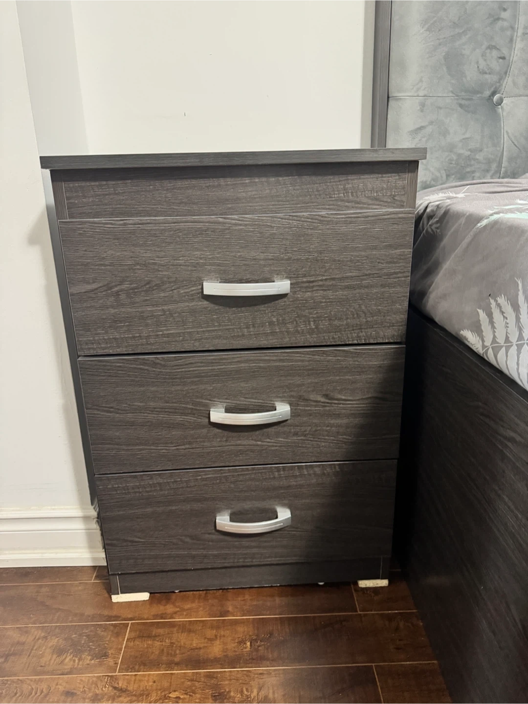 A 3-drawer nightstand with a dark wood grain finish. It features sleek silver metal handles on each drawer. This piece offers convenient bedside storage.