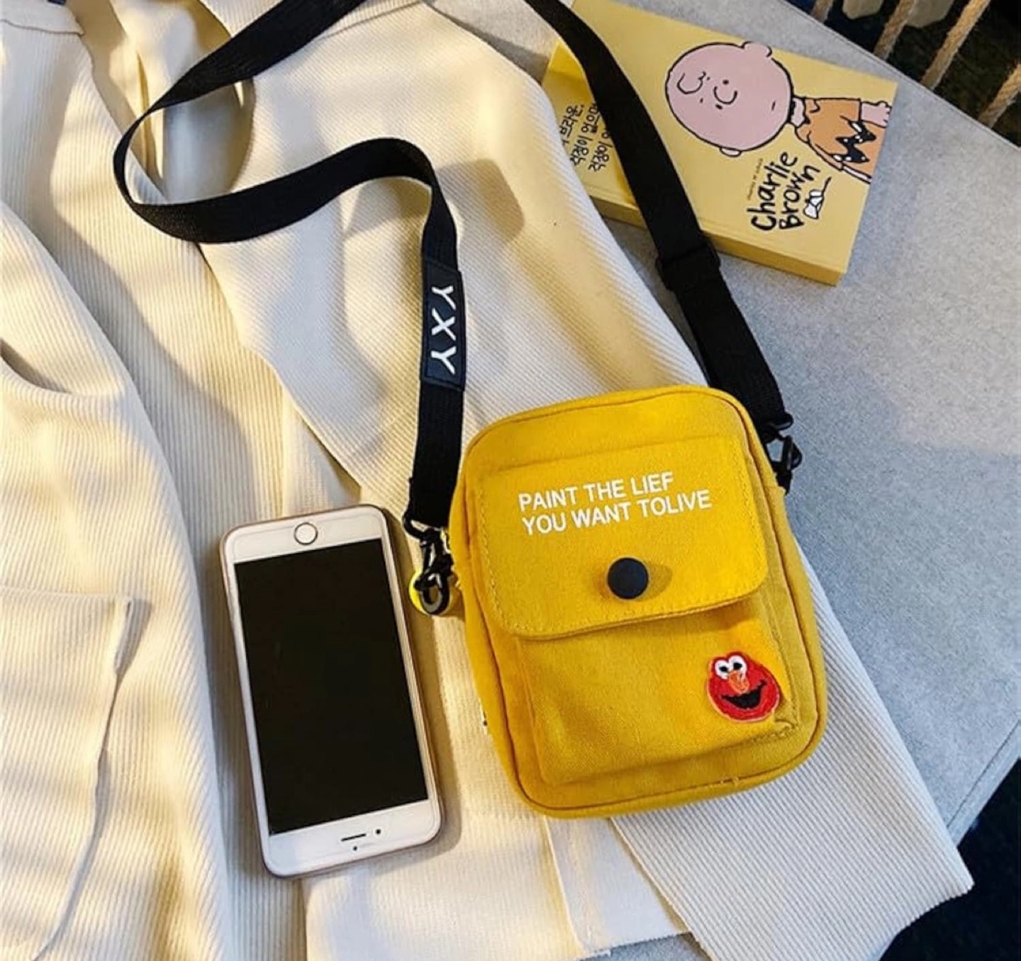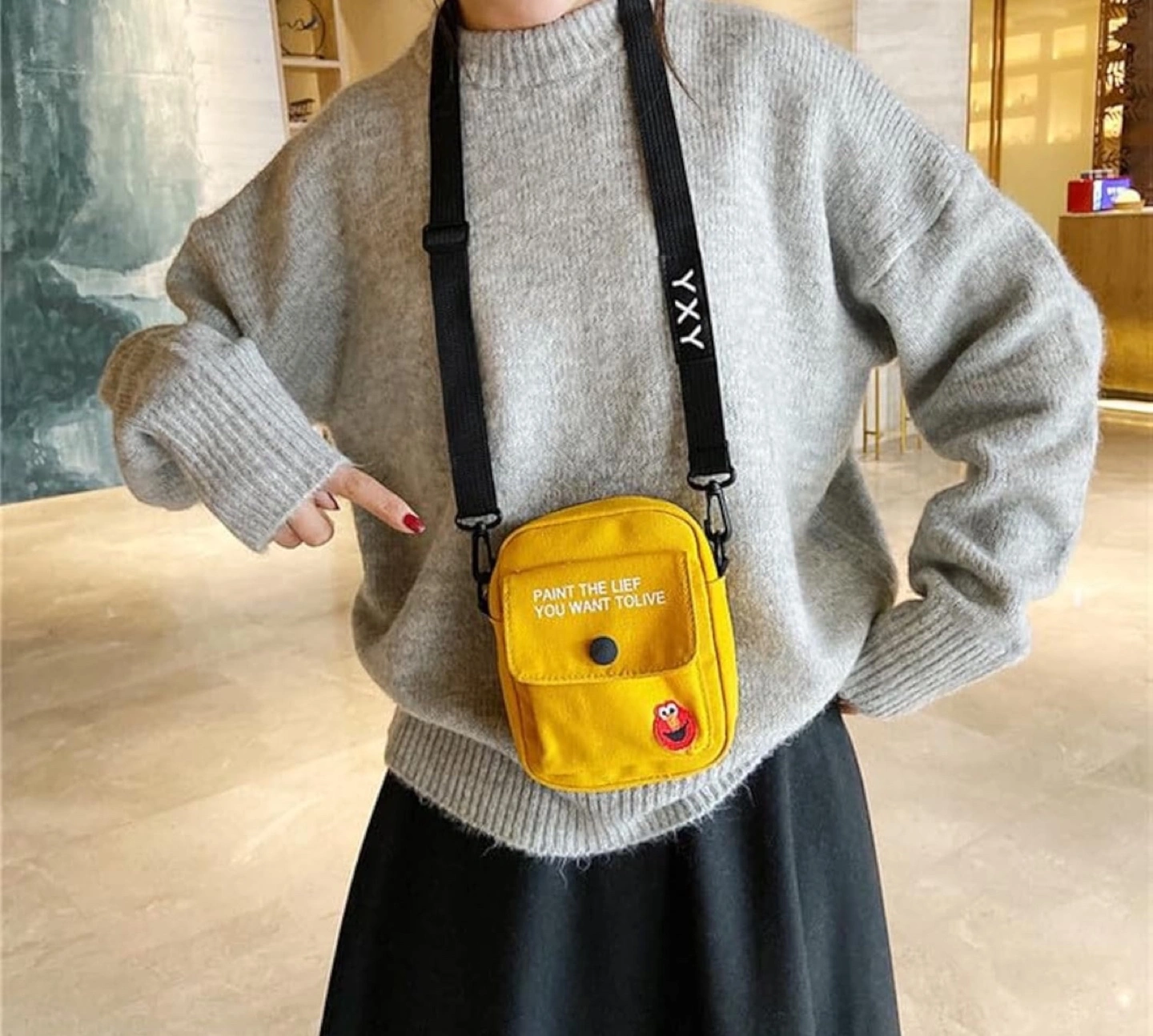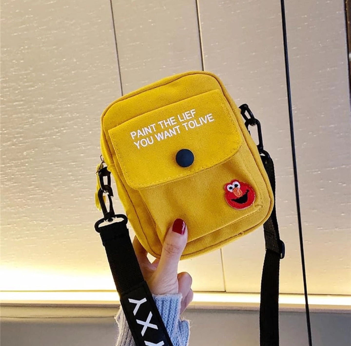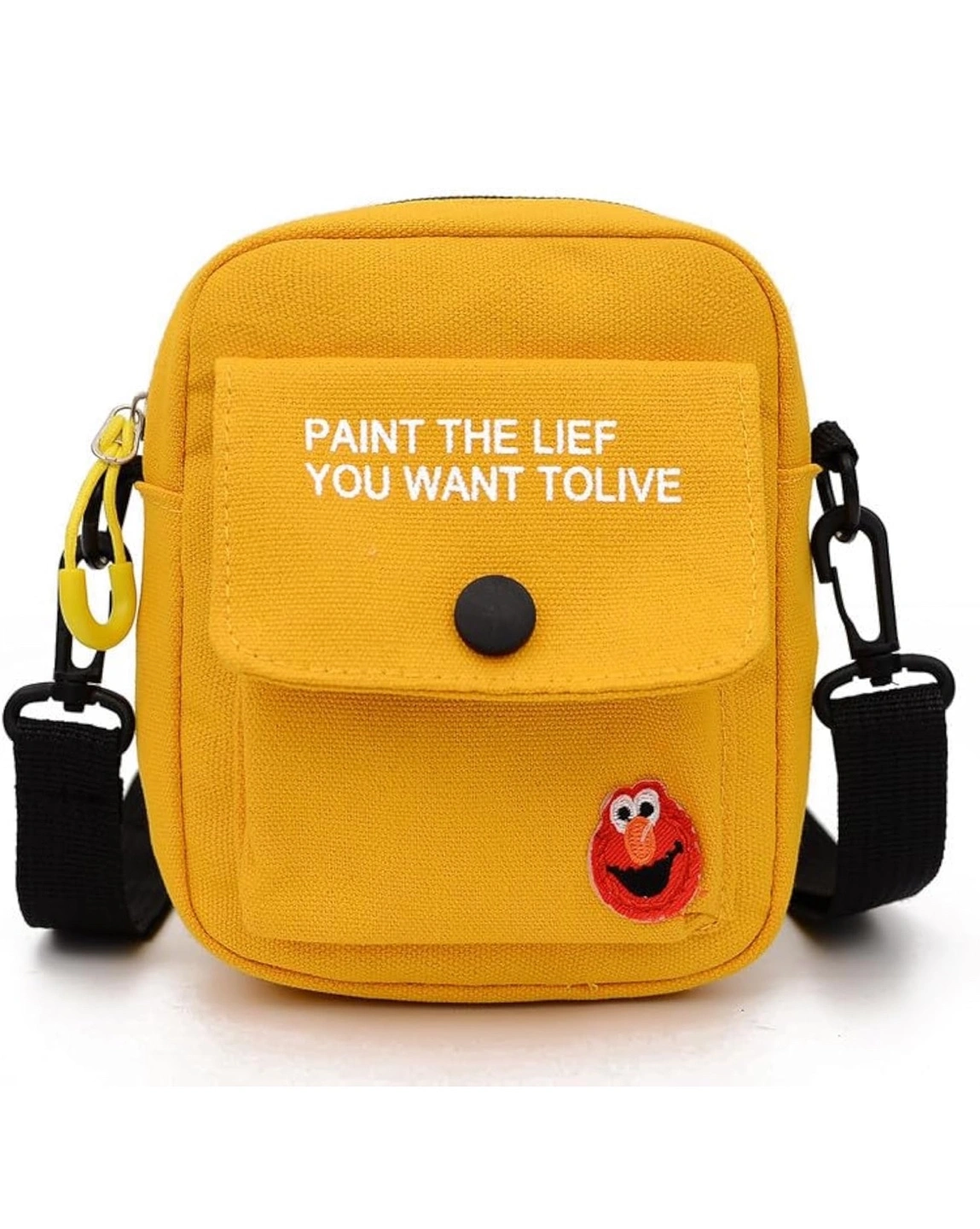 Cute yellow canvas crossbody bag. Features a small front pocket, adjustable strap, and embroidered Sesame Street character. Perfect for everyday use.