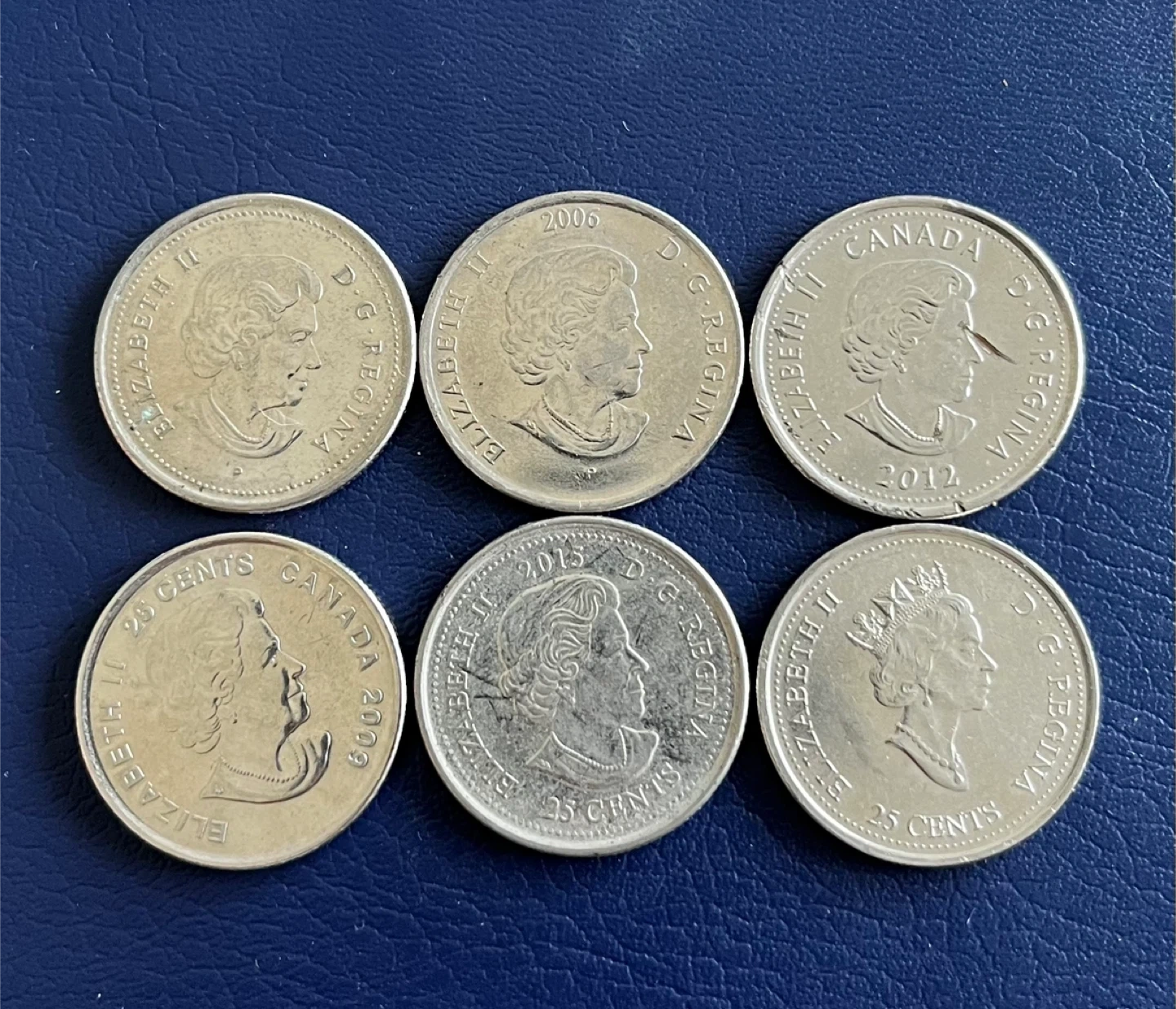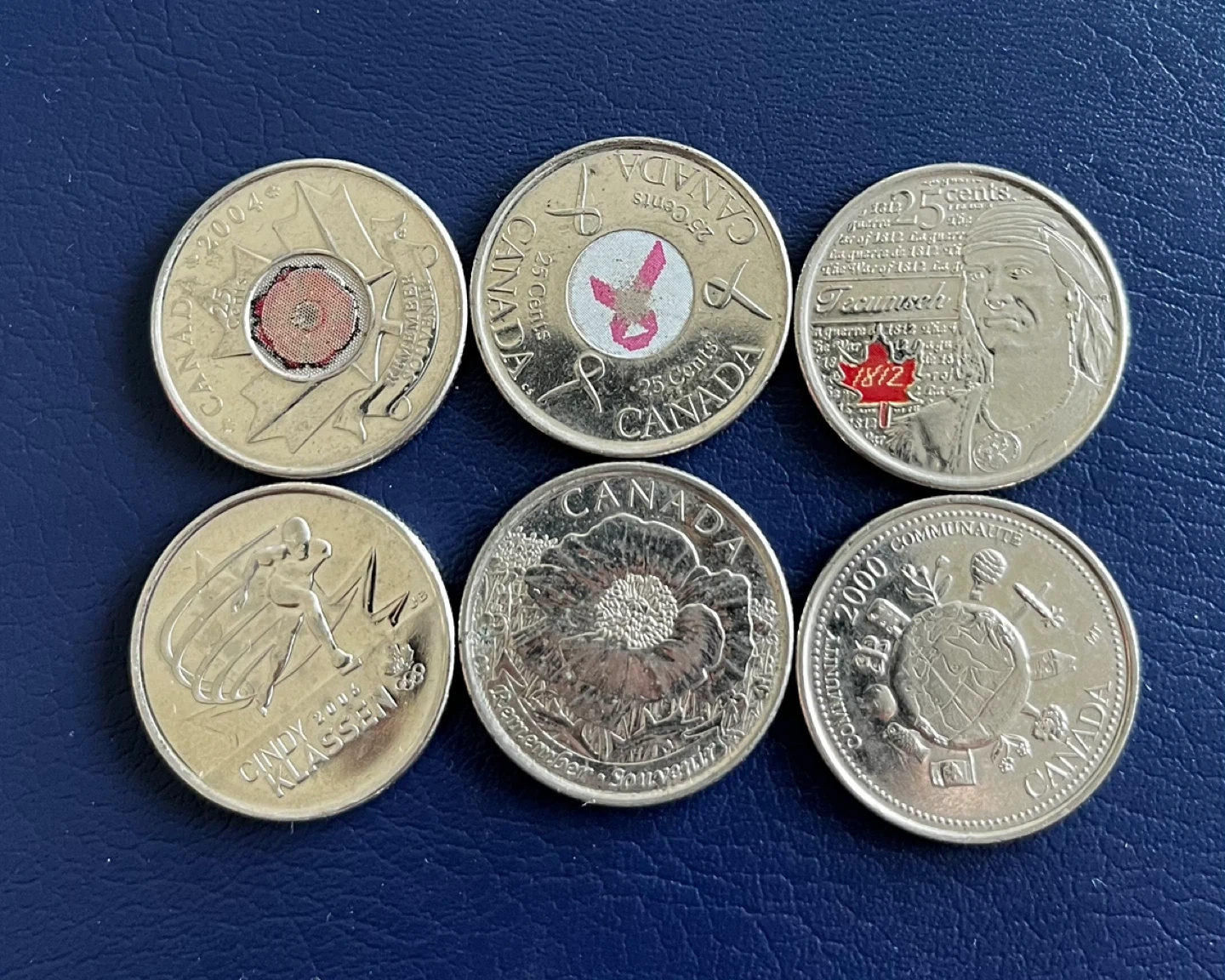 Colour and design Includes various Canadian quarters from different years and designs. Some coins feature special commemorations. These are standard 25 cent denominations.