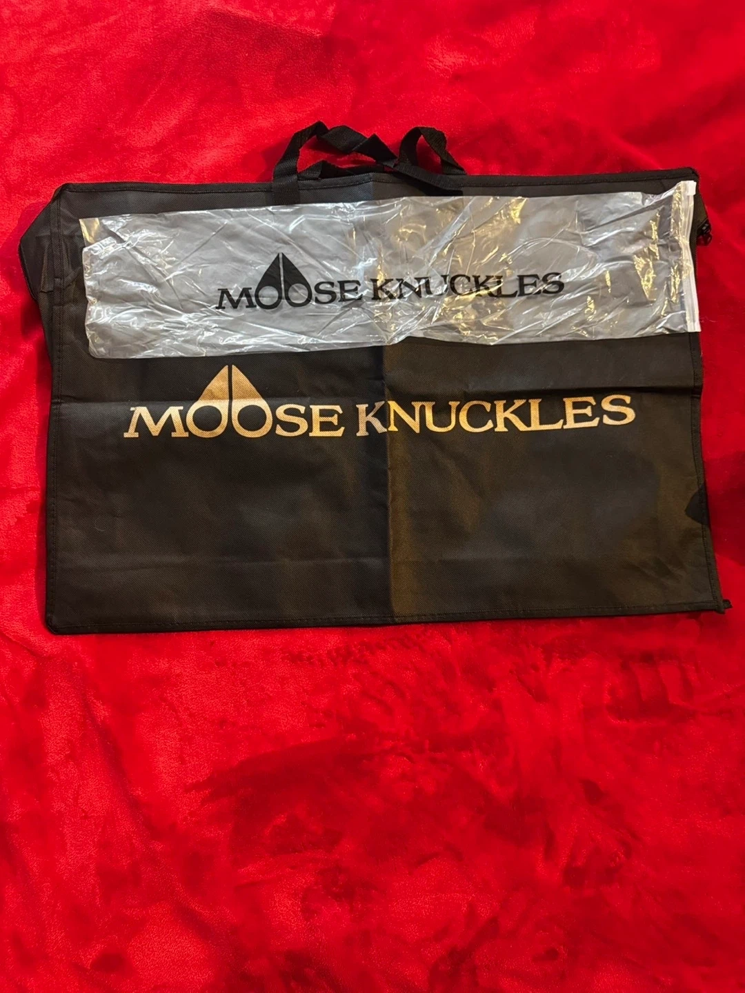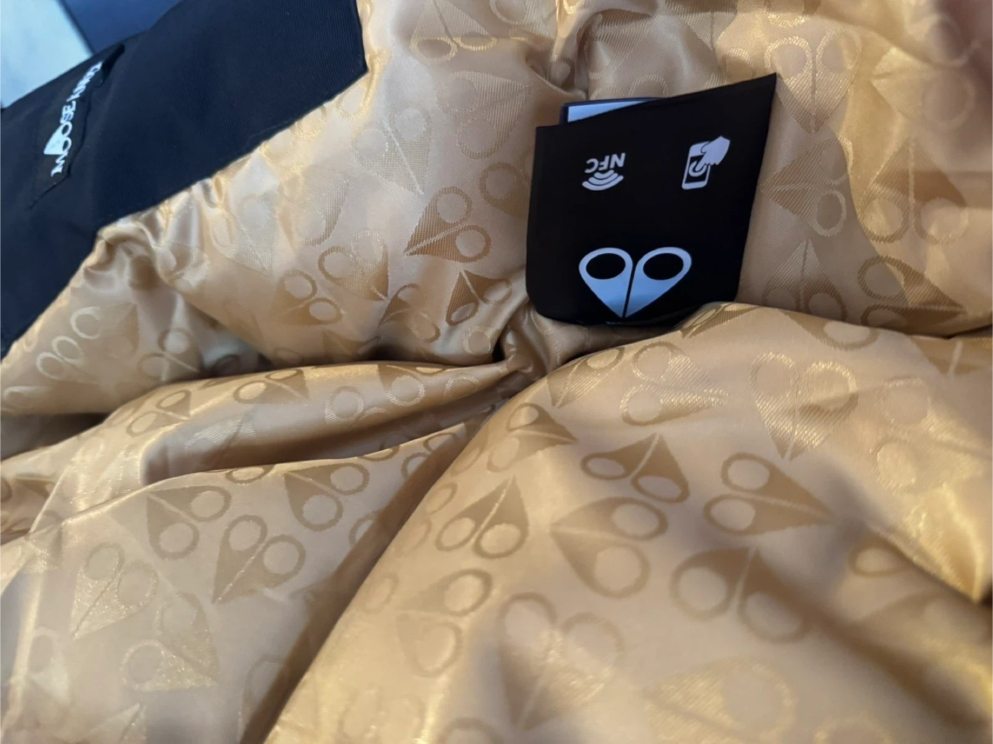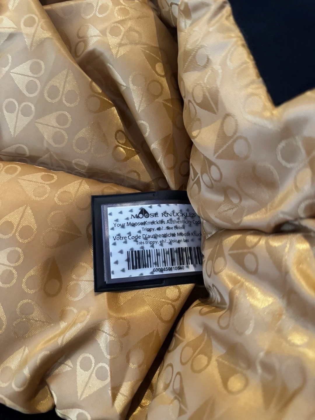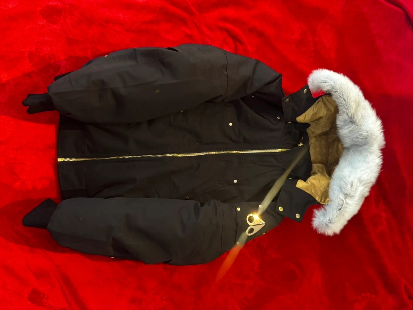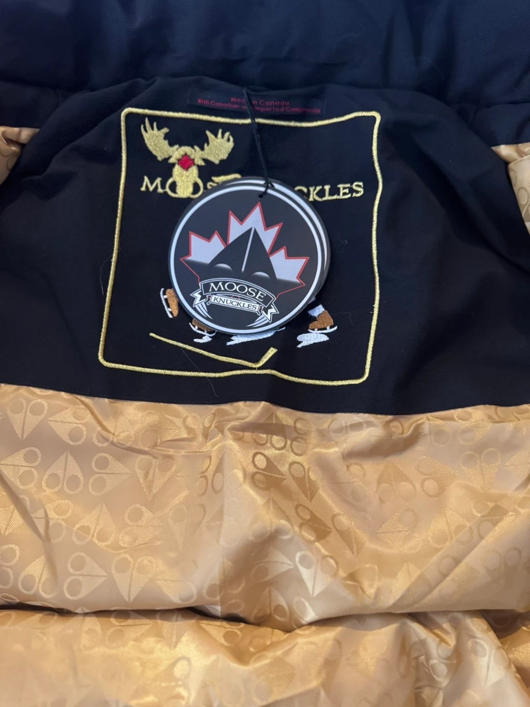 Black Moose Knuckles puffer parka jacket with a fur-lined hood. It has a gold patterned interior lining. This jacket is warm and stylish for colder weather.o