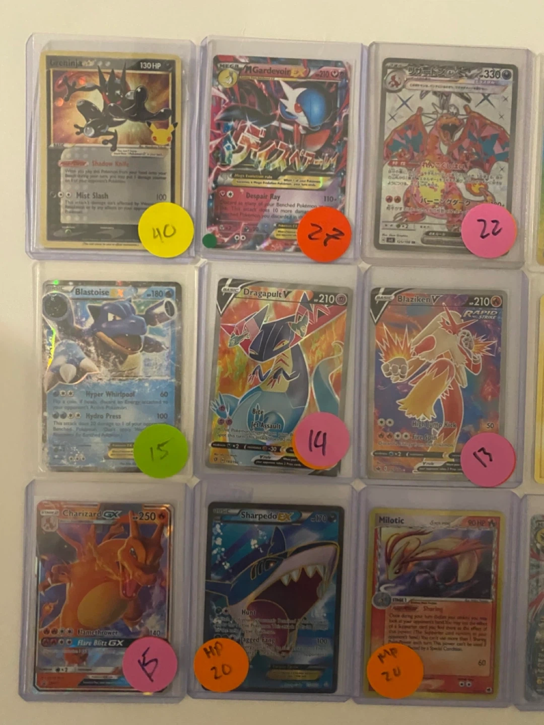 This is a collection of various Pokemon trading cards, featuring popular characters like Charizard GX and Blastoise. The cards are in protective sleeves and offer a range of HP and attack power. Great for collectors and players alike!