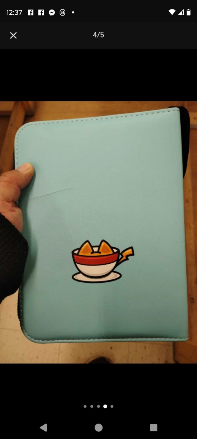 This card binder has a light blue cover with a cute ramen bowl graphic. It features multiple clear pockets for storing and organizing cards. The zipper closure keeps everything secure inside.