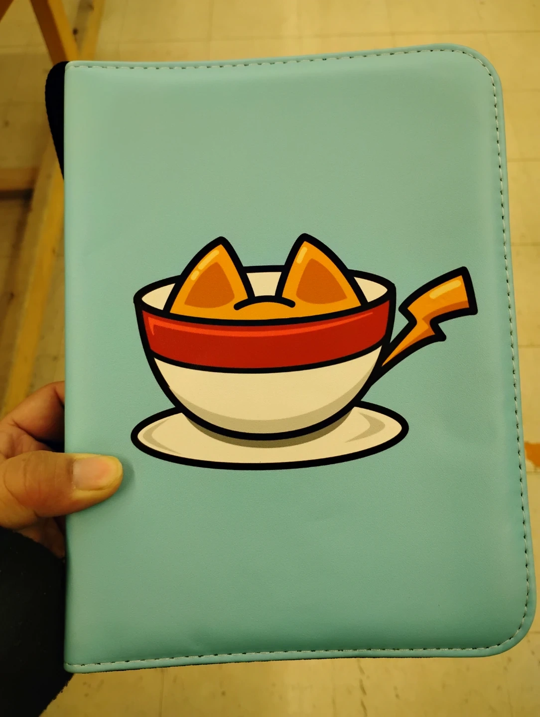 This card binder has a light blue cover with a cute ramen bowl graphic. It features multiple clear pockets for storing and organizing cards. The zipper closure keeps everything secure inside.