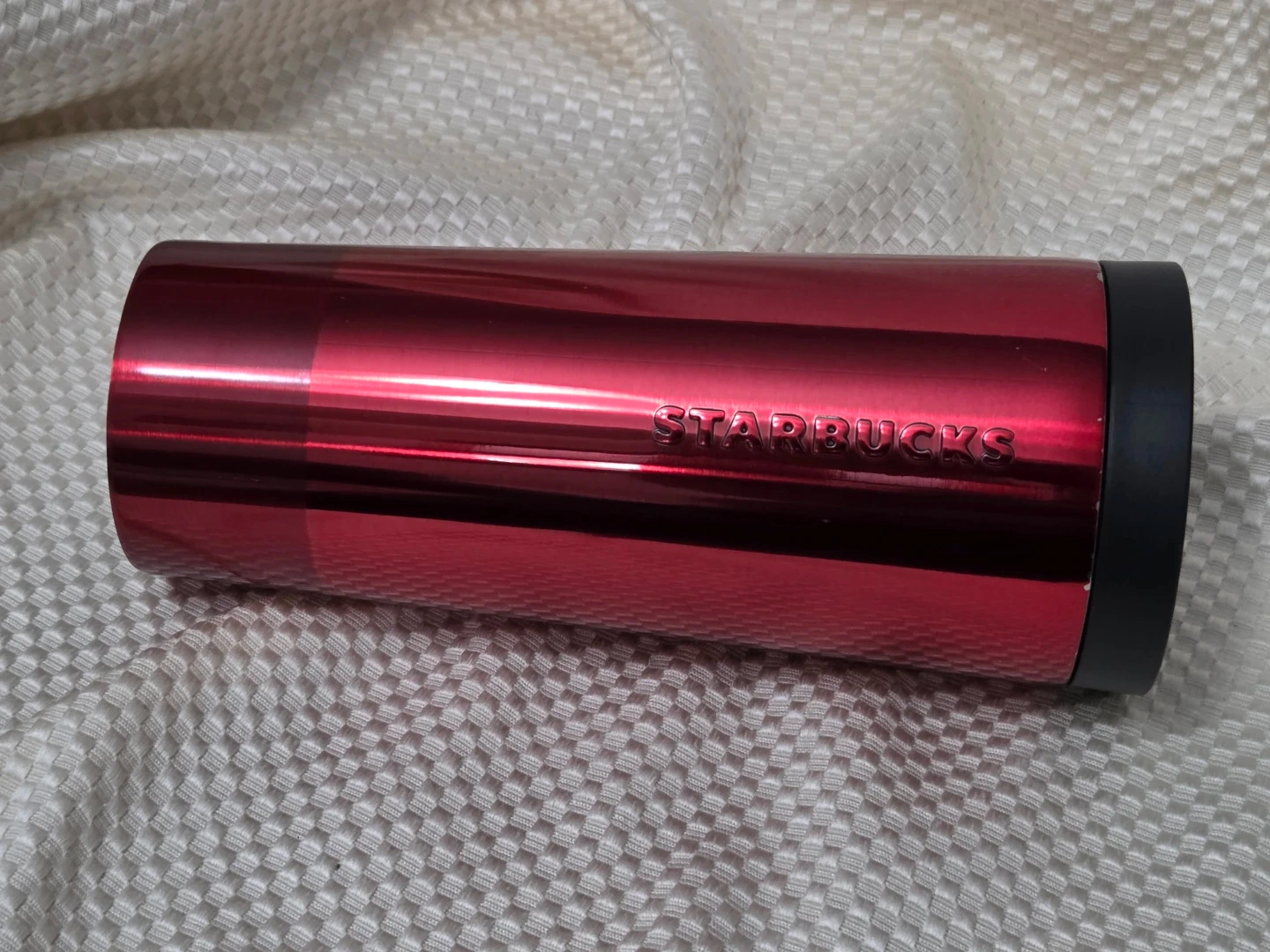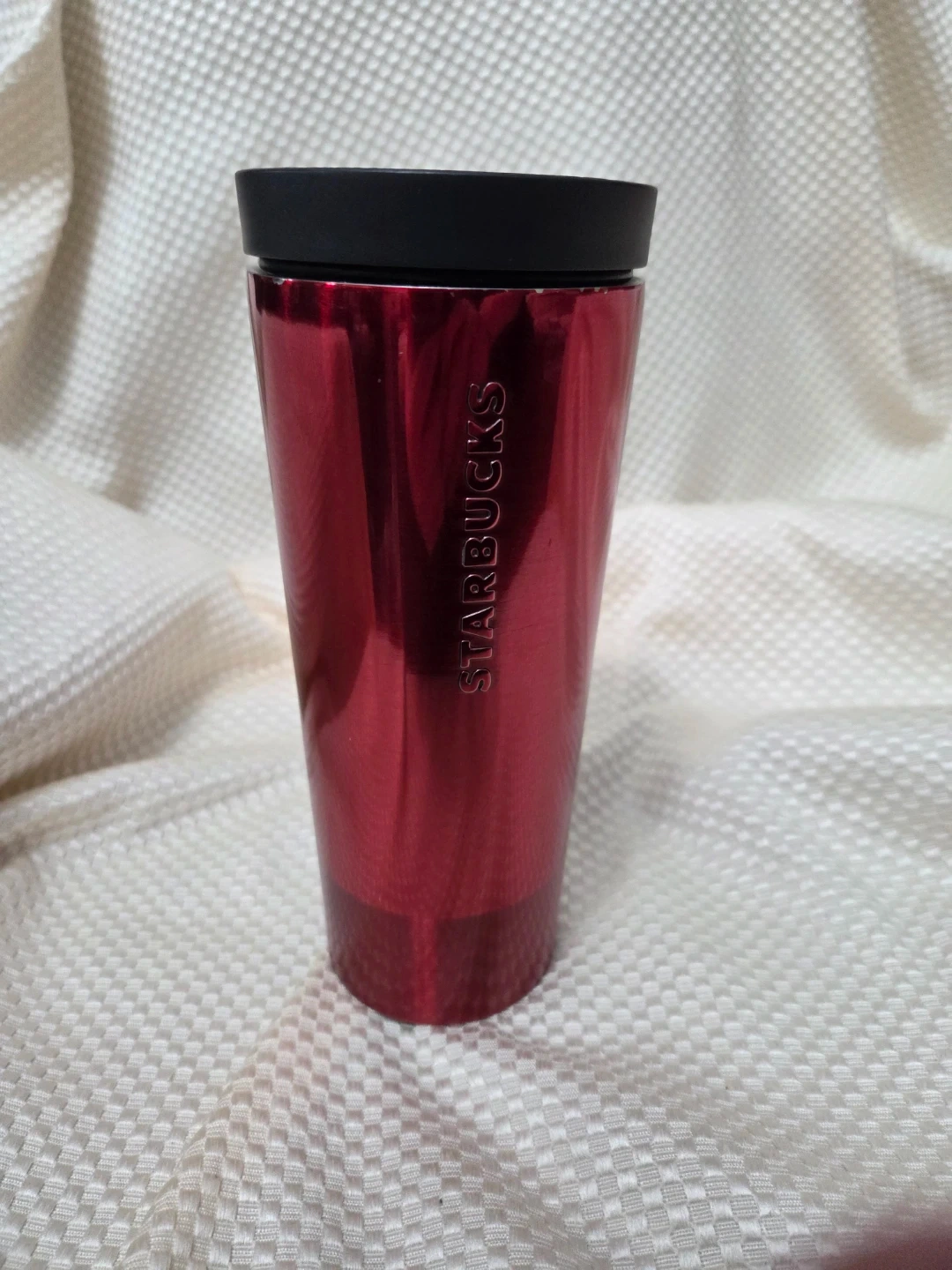 Here's a Starbucks red stainless steel tumbler! It holds 16 fl oz/473 mL. Perfect for keeping your drinks hot or cold on the go. There are a few areas where the red has worn off due to use. Really good condition.