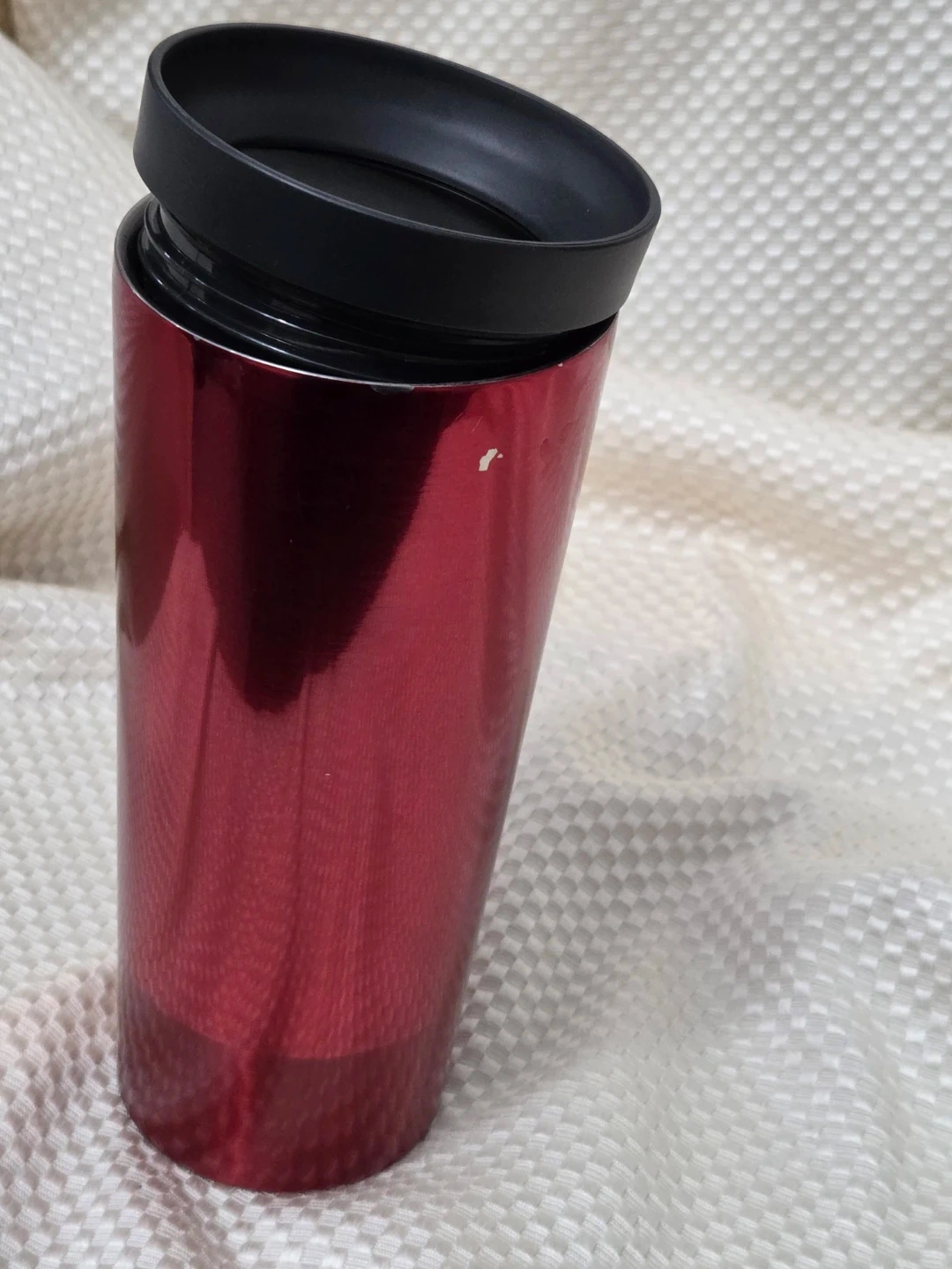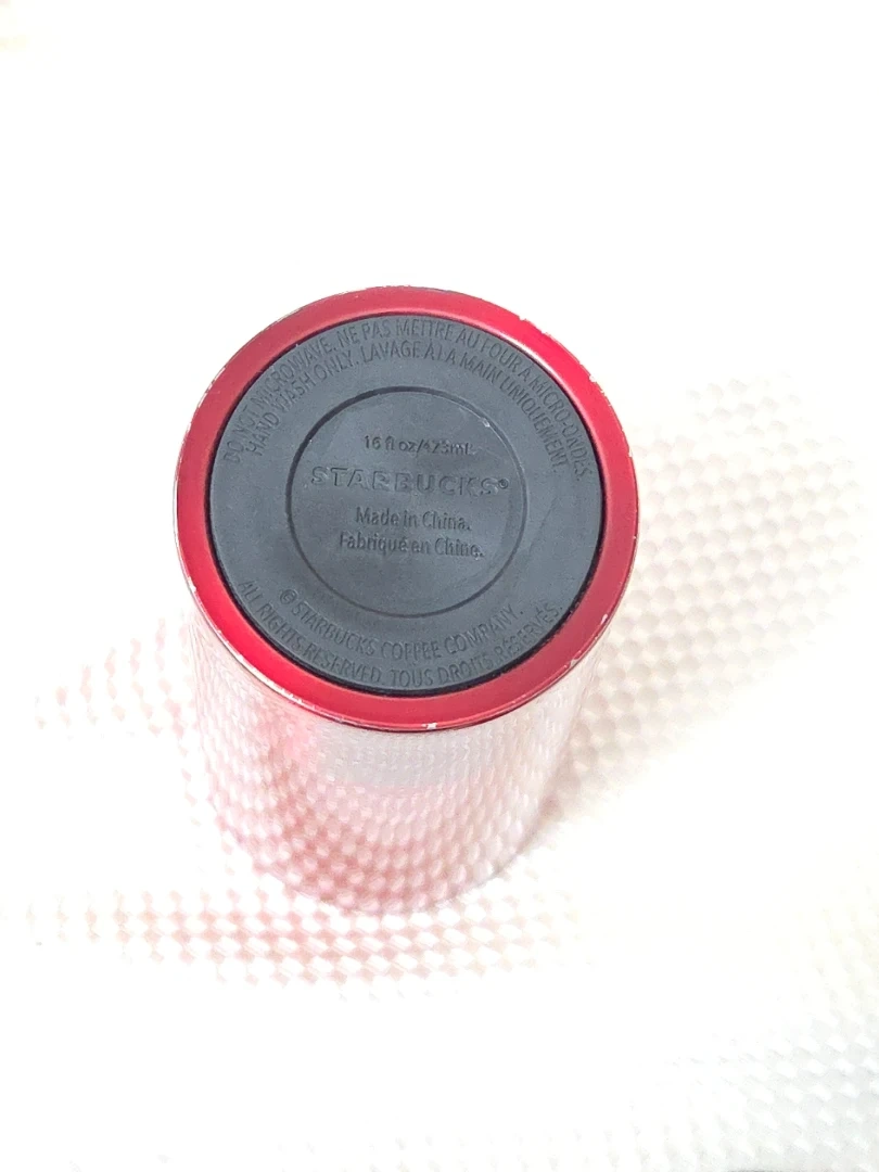 Here's a Starbucks red stainless steel tumbler! It holds 16 fl oz/473 mL. Perfect for keeping your drinks hot or cold on the go. There are a few areas where the red has worn off due to use. Really good condition.