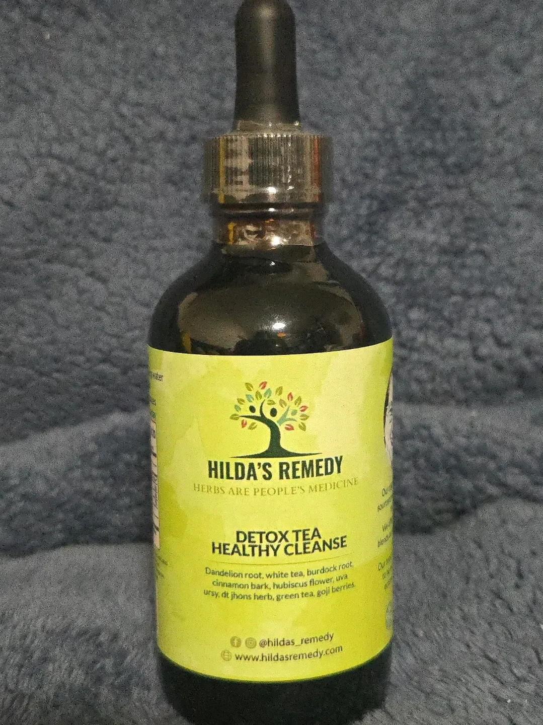This is Hilda's Remedy Organic Detox Tonic 4oz Healthy Cleanse liquid extract. It contains dandelion root, white tea, burdock root, cinnamon bark, and hibiscus flower. Vegan, gluten-free, and non-GMO. It's easier to take and faster absorption than traditional teas.