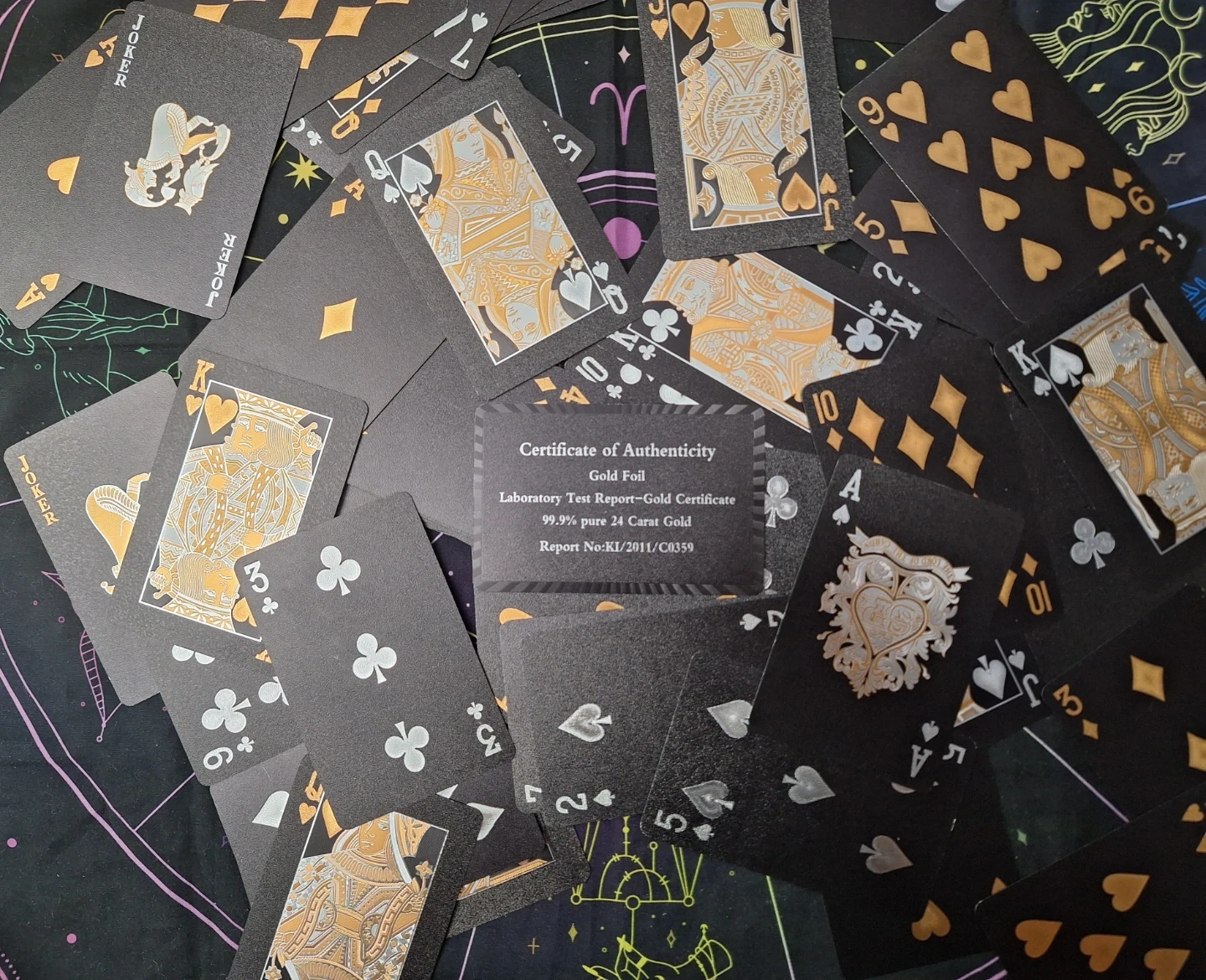 This is a deck of playing cards with gold foil accents - 99.9% pure 24 Carat Gold- laboratory tested. They come with a certificate of authenticity. These cards would be great for a game night or as a unique gift! Deck has 52 cards.