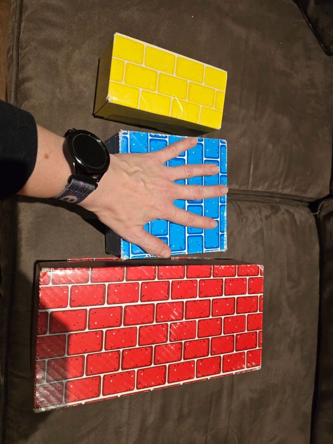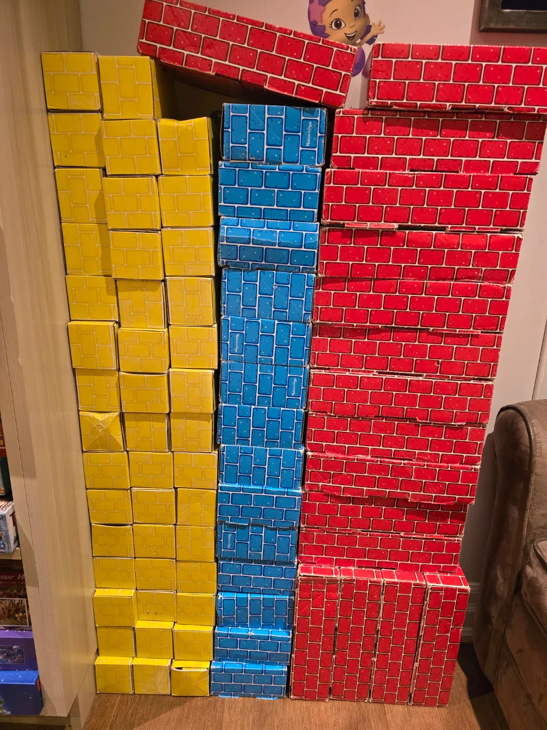 Used jumbo cardboard blocks. A few you can tell have been squished and put back together but most are in decent condition (been mostly unused after a few months of play, but that was almost 10 years ago and they sometimes fall and get kicked around). Remarkably durable for just being cardboard
