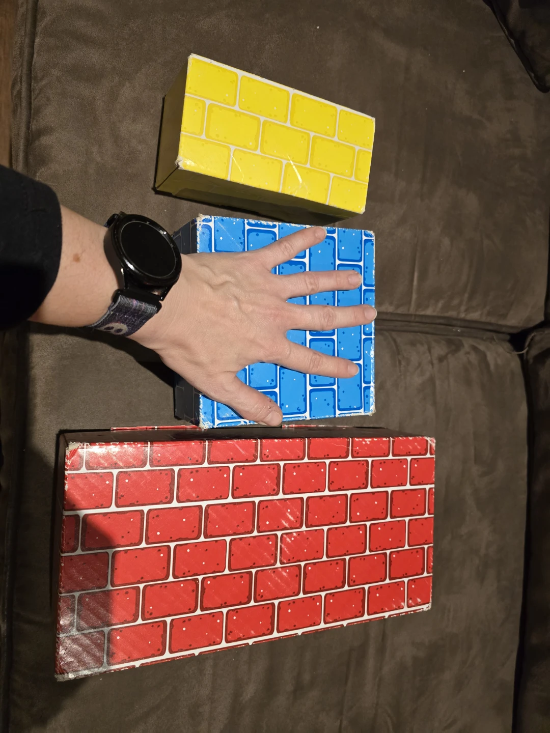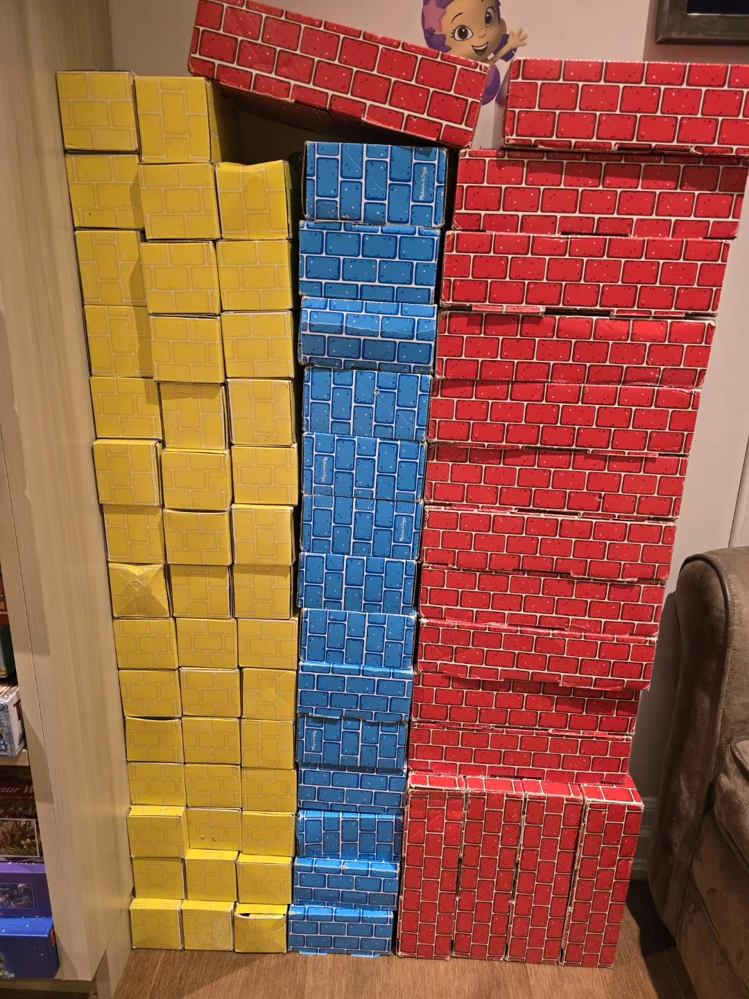 Used jumbo cardboard blocks. A few you can tell have been squished and put back together but most are in decent condition (been mostly unused after a few months of play, but that was almost 10 years ago and they sometimes fall and get kicked around). Remarkably durable for just being cardboard