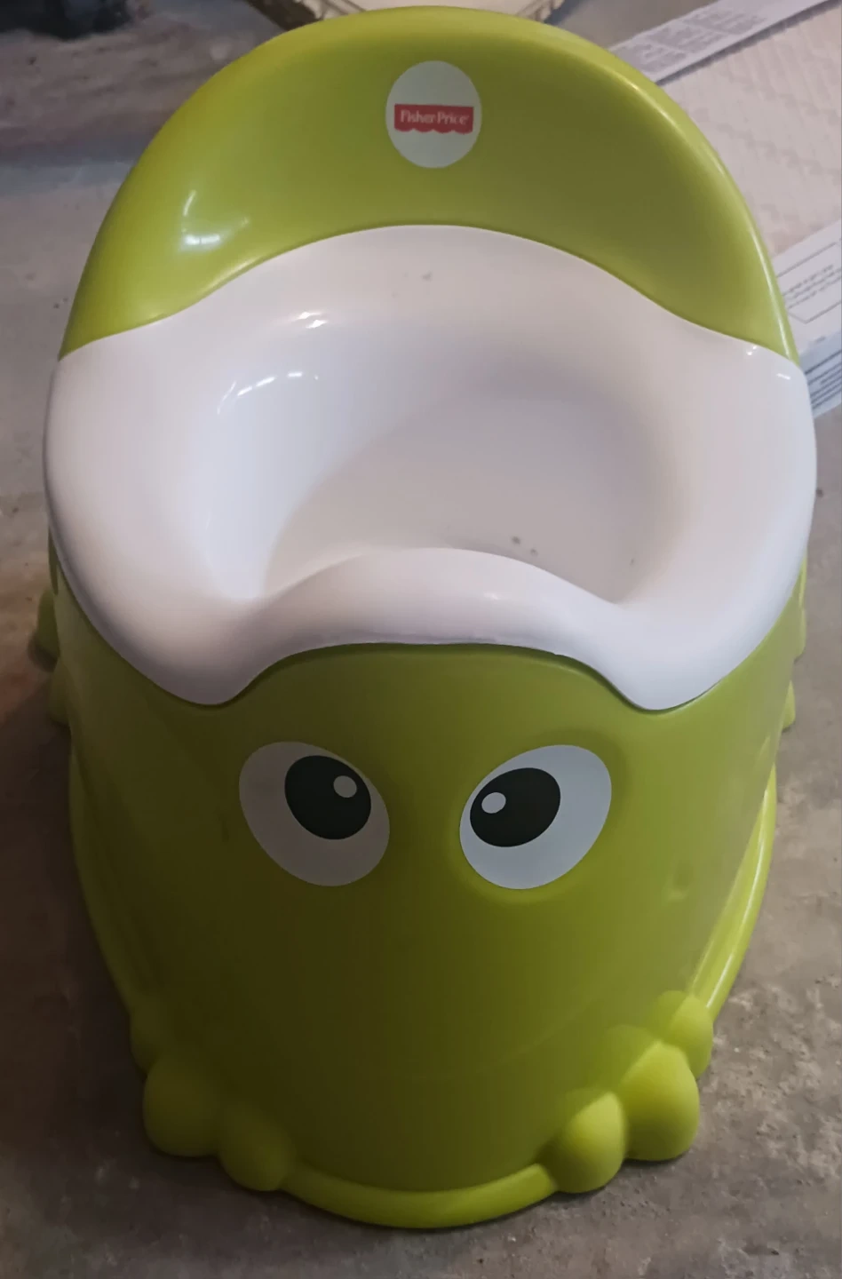 Fisher-Price potty training chair in a fun frog design. It's green and white with a removable seat insert. This potty chair is made of plastic.