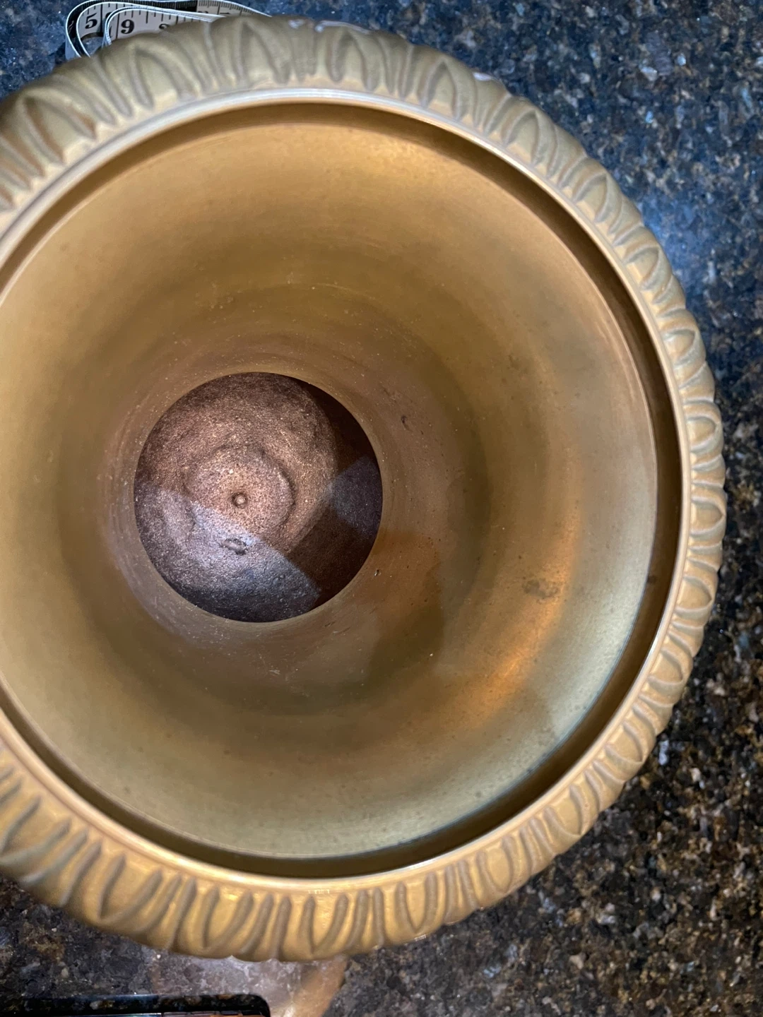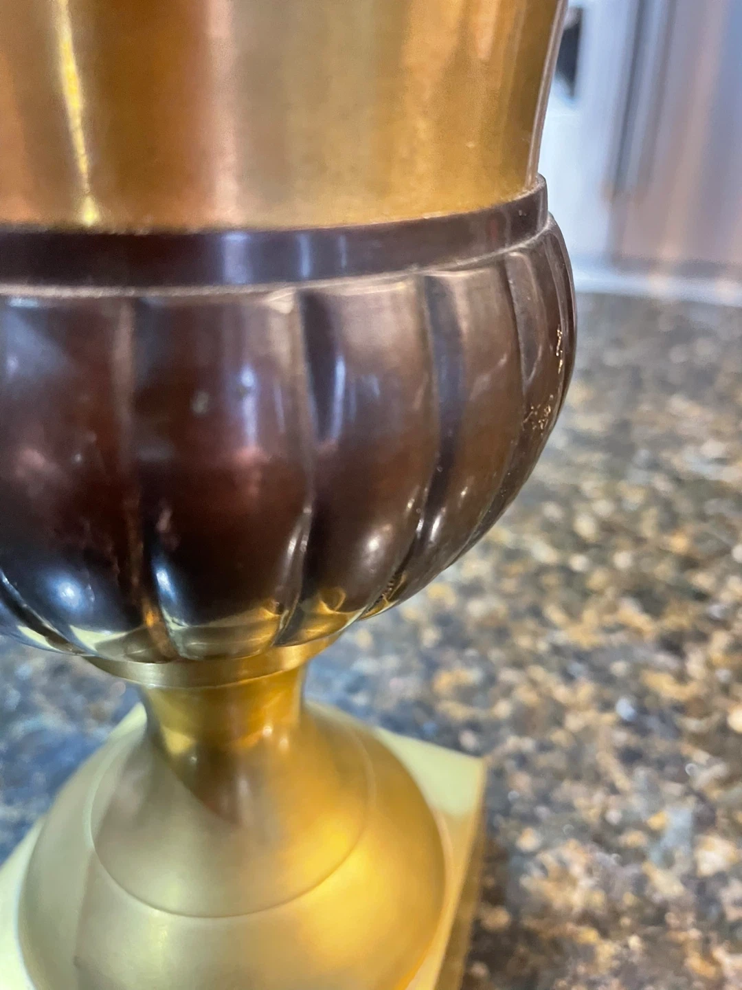 This is a decorative brass urn with a fluted dark brown section. It has a weighted brass base with felt lining. Its classic design makes it a handsome addition to any home.