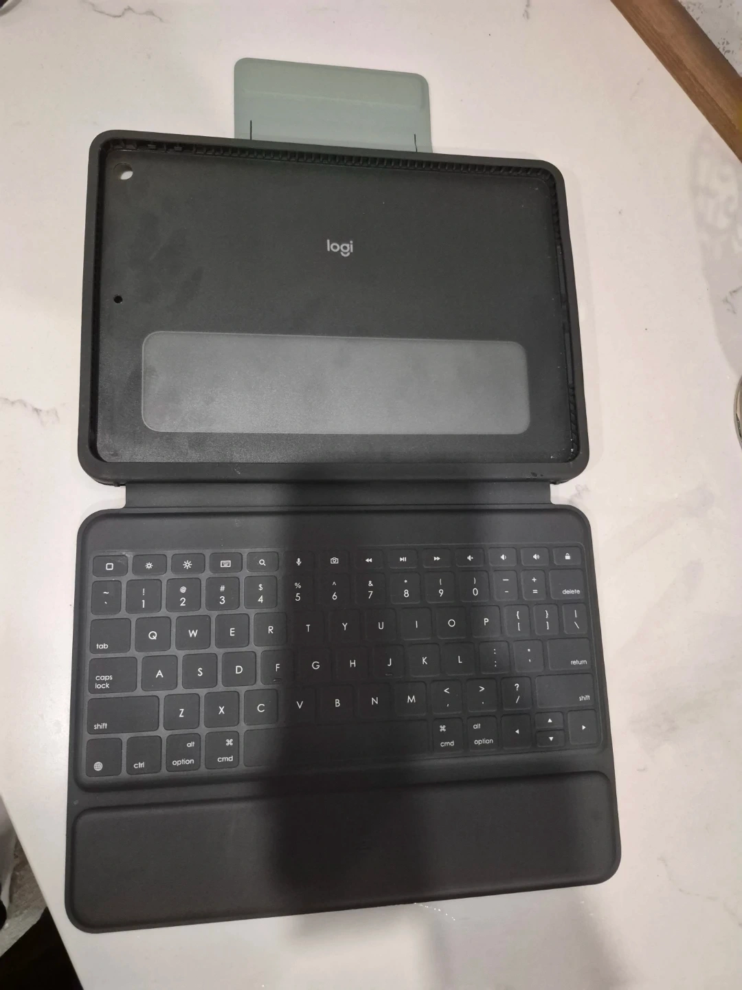 This is a Logi keyboard case. It's a dark grey colour. The case includes a QWERTY keyboard layout for easy typing.