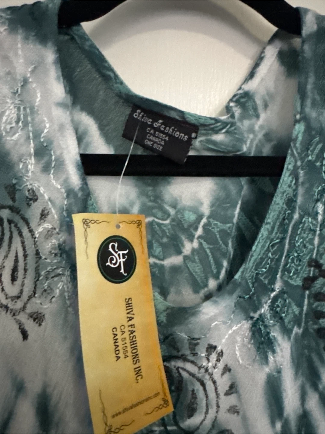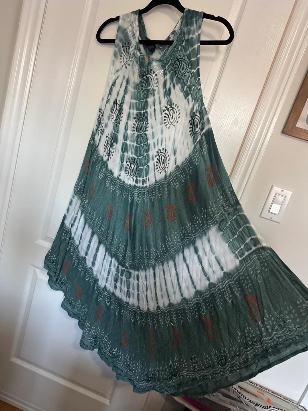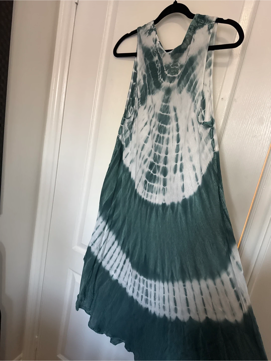 Flowy sleeveless dress with a tie-dye pattern in green and white. It's made of 100% viscose. This one-size dress is comfy and breezy for warm weather!