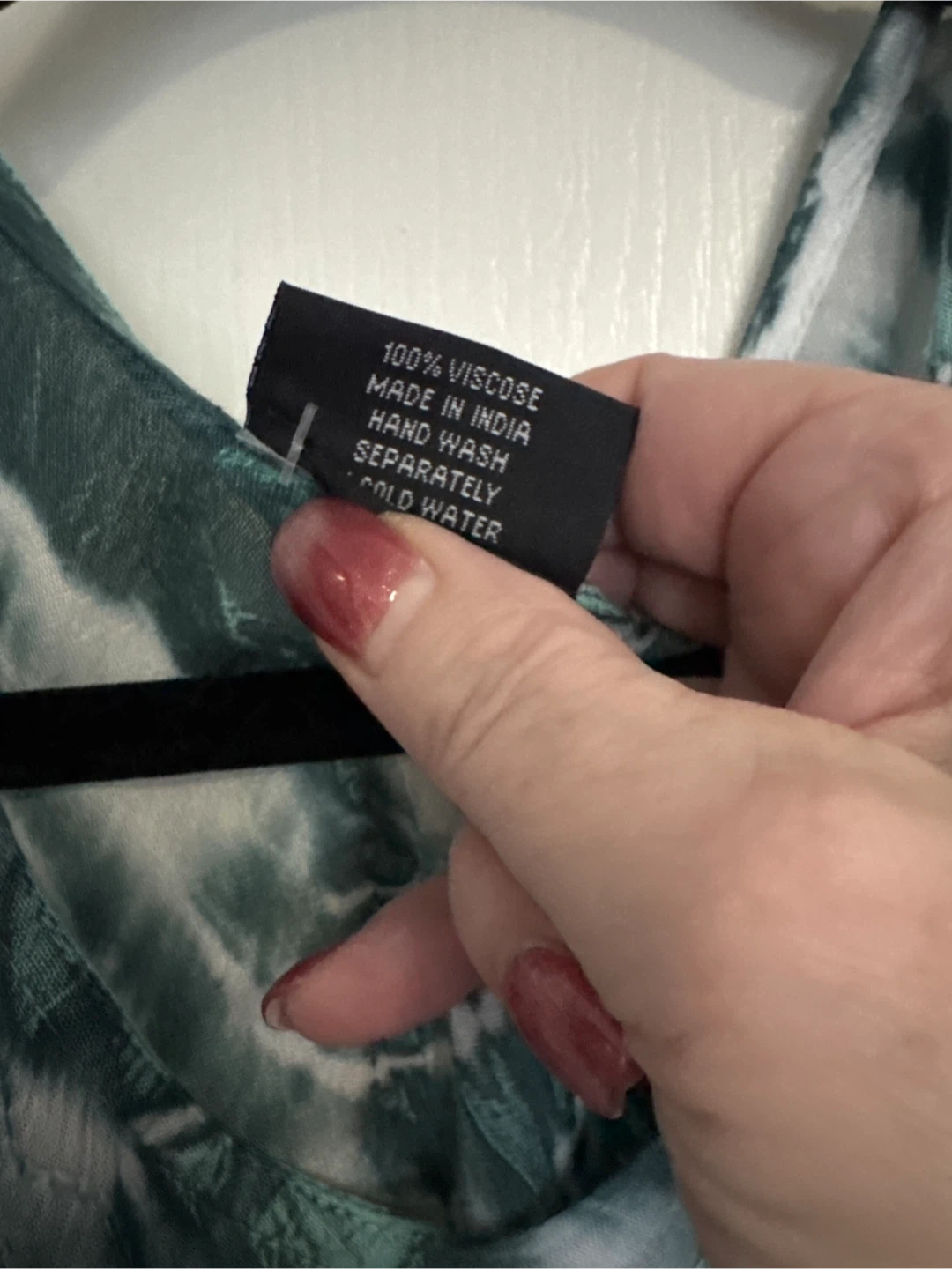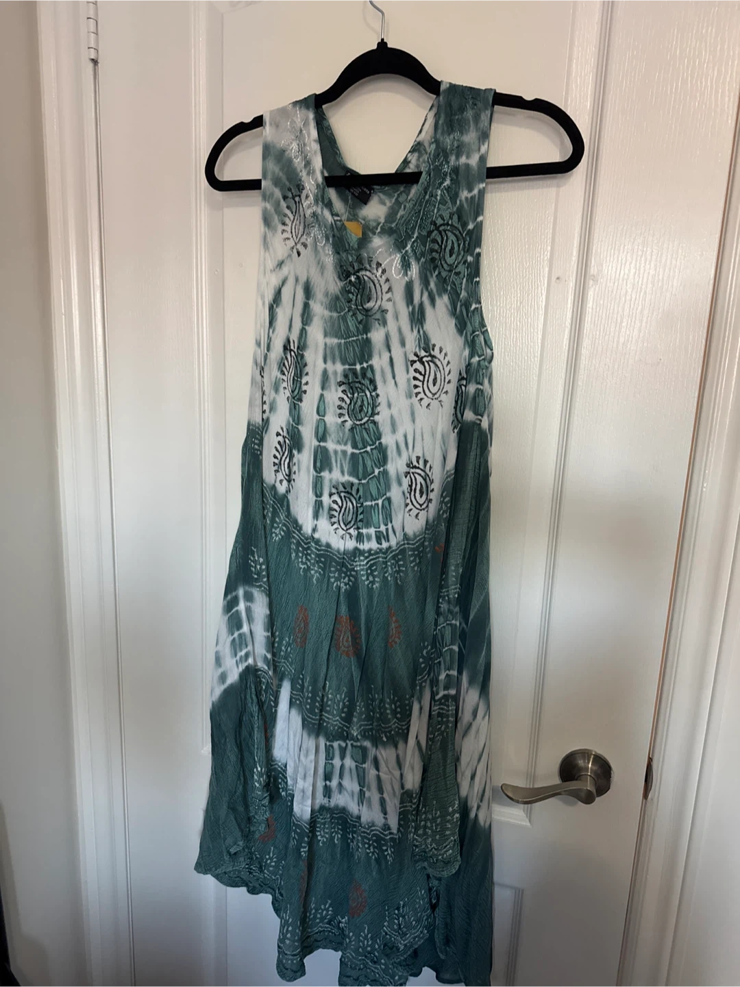 Flowy sleeveless dress with a tie-dye pattern in green and white. It's made of 100% viscose. This one-size dress is comfy and breezy for warm weather!