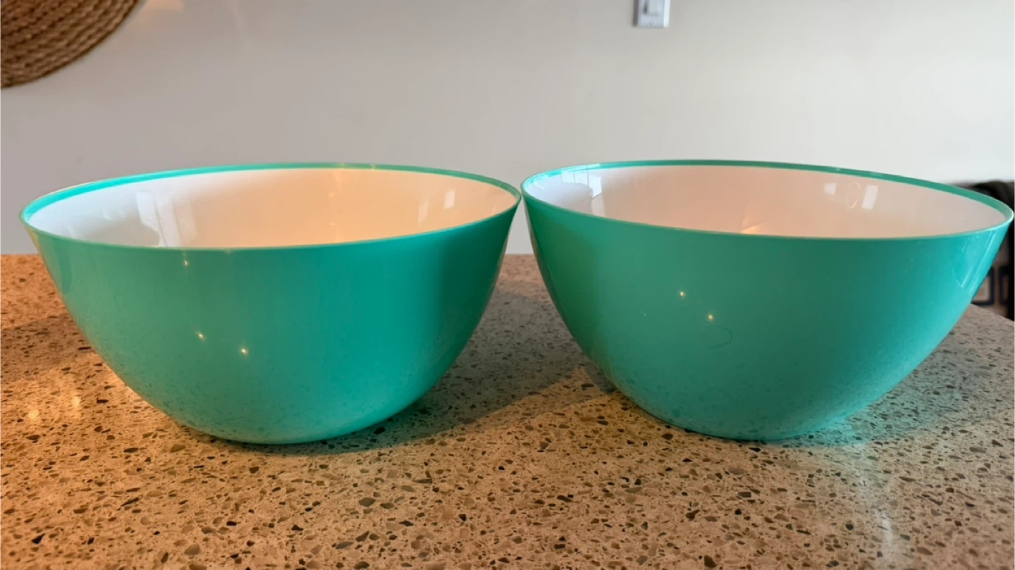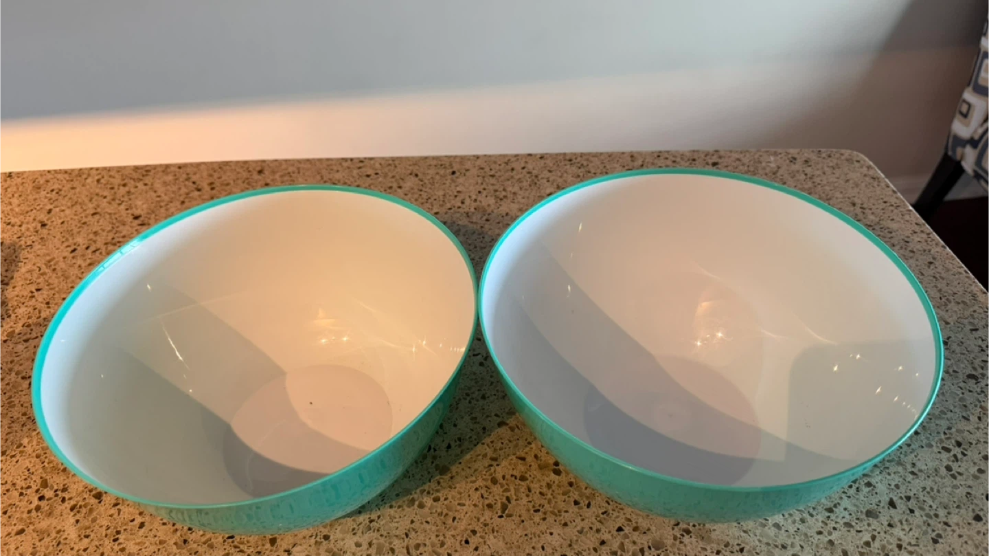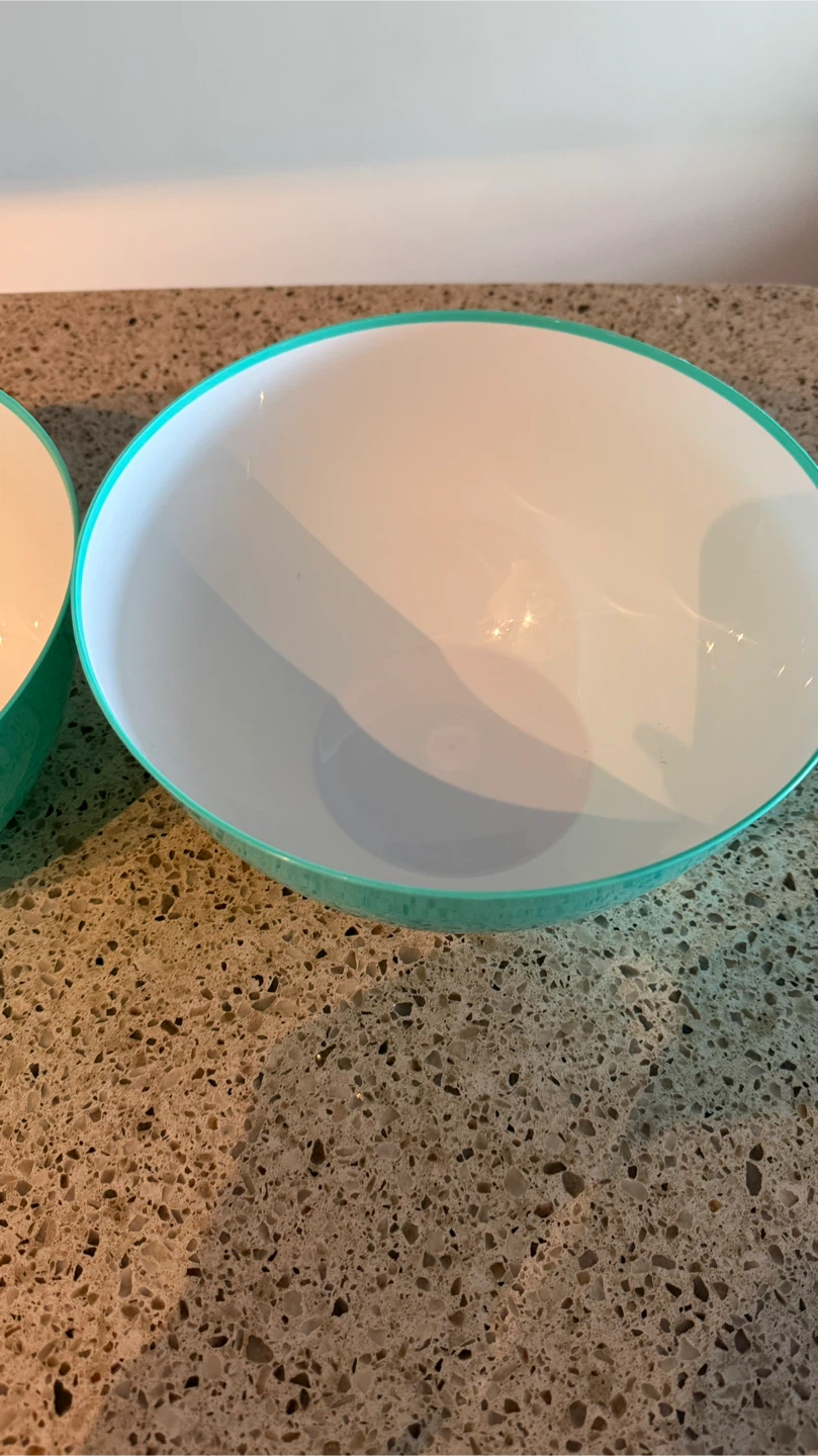 Two plastic mixing bowls with a teal exterior and white interior. They're a great size for salads or mixing ingredients. Suitable for everyday kitchen use!