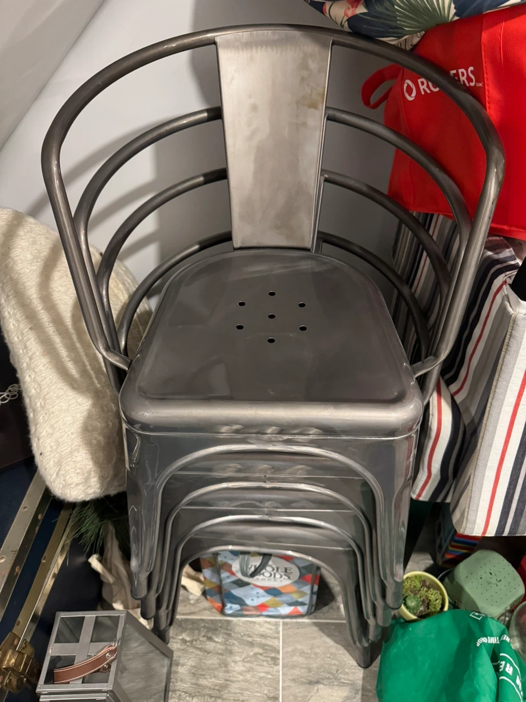 Stackable metal chair with a brushed nickel finish. This industrial-style chair has a curved back and a seat with drainage holes. It's suitable for indoor or outdoor use. In excellent condition.