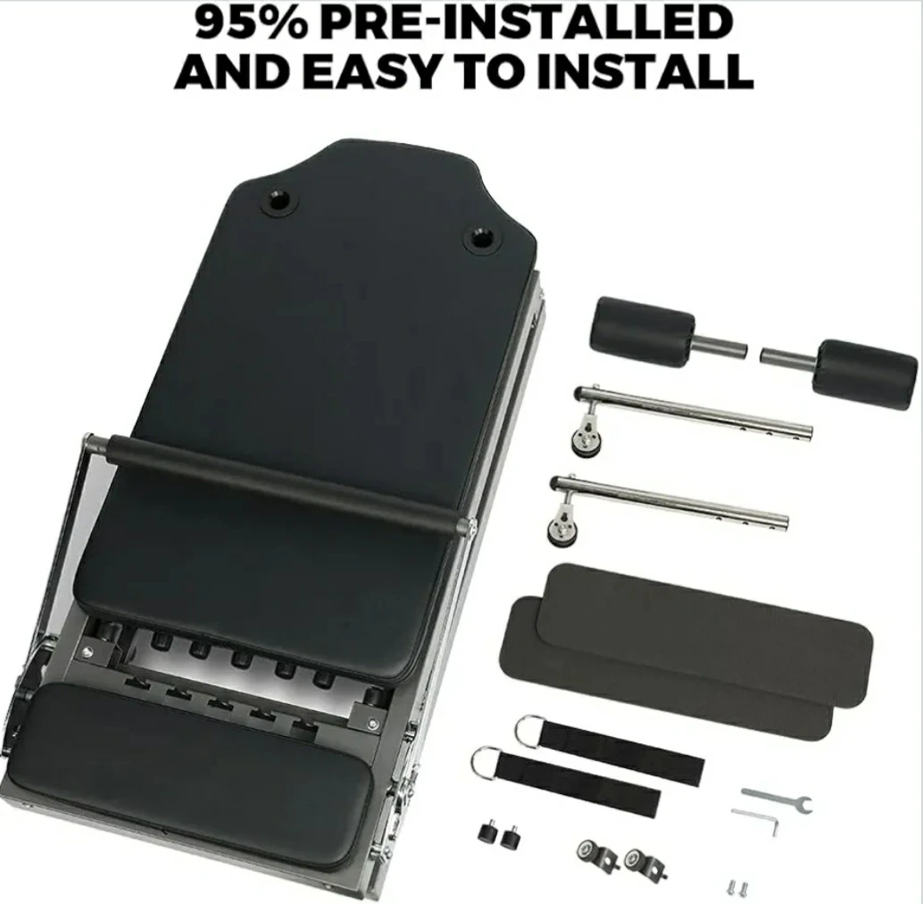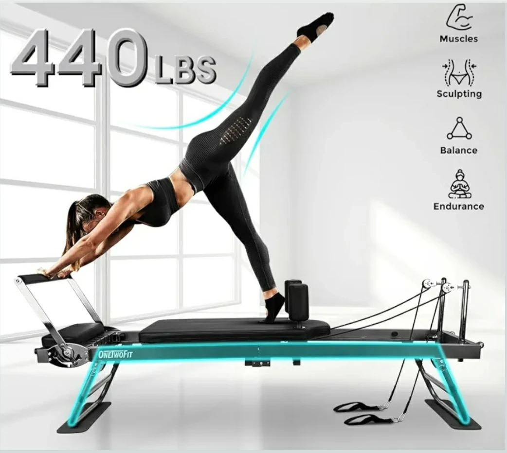 This ONE TWO FIT Pilates reformer is designed for a comprehensive workout. It's constructed with a sturdy metal frame and features comfortable padding. Comes with resistance bands and accessories for a full-body exercise routine.