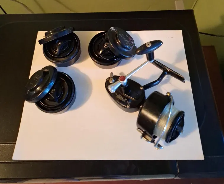This is a Mitchell 301 fishing reel. It comes with three extra spools for different line options. The reel is black with silver and red accents.