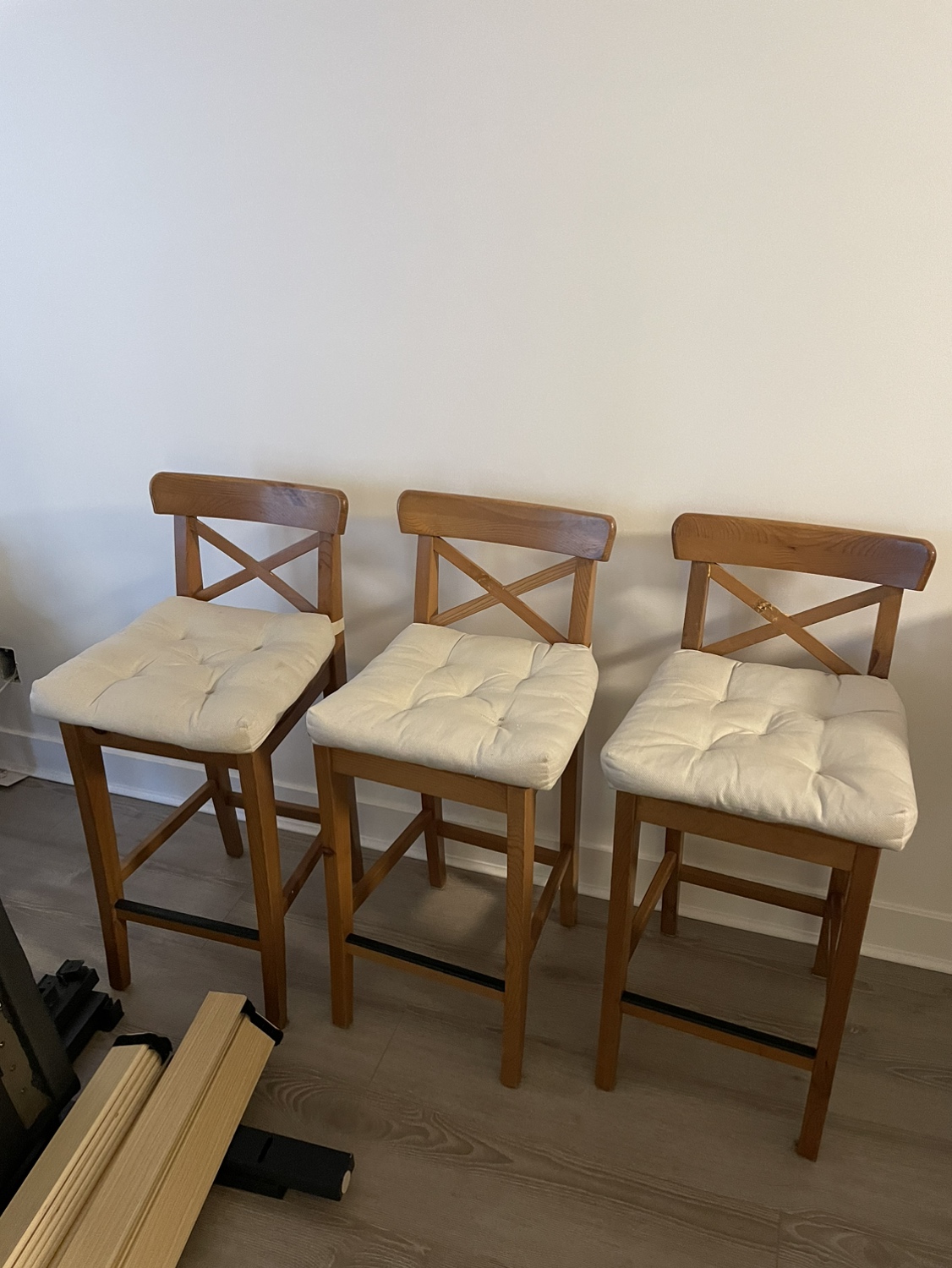 3 Wooden Counter Stools with cushions. They are all in good condition except one has been repaired where the back broke. Structure is solid! $200 obo.