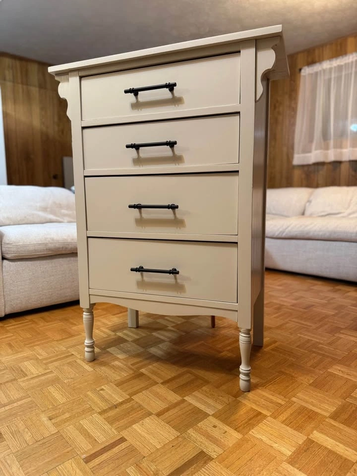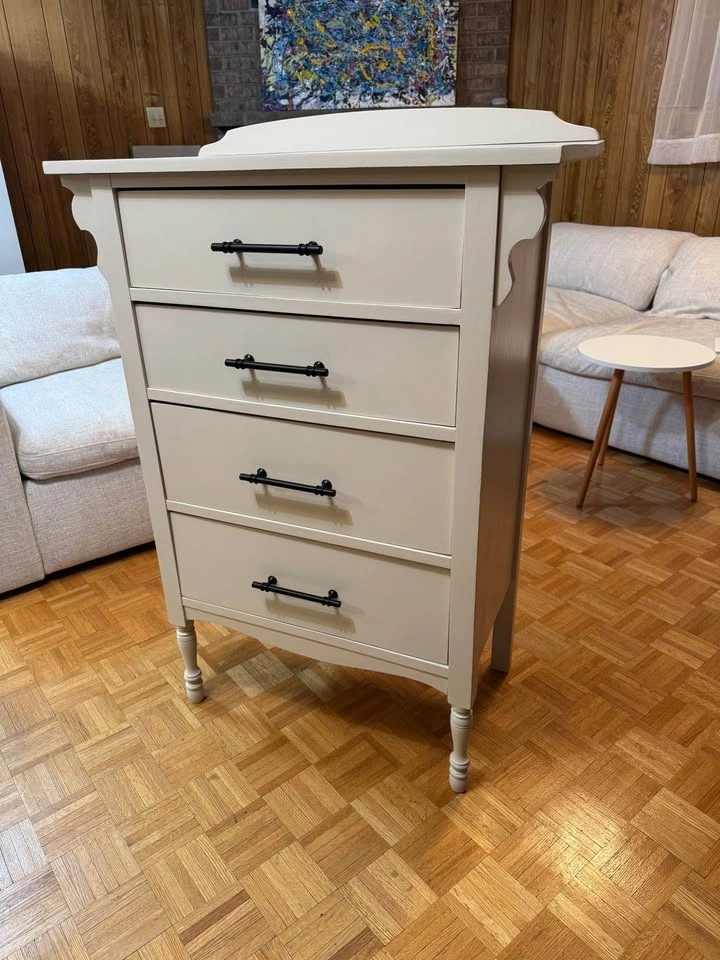 Beautifully refinished solid wood dresser with a modern, clean design. Painted in a warm neutral tone with a smooth, durable finish and upgraded black hardware.