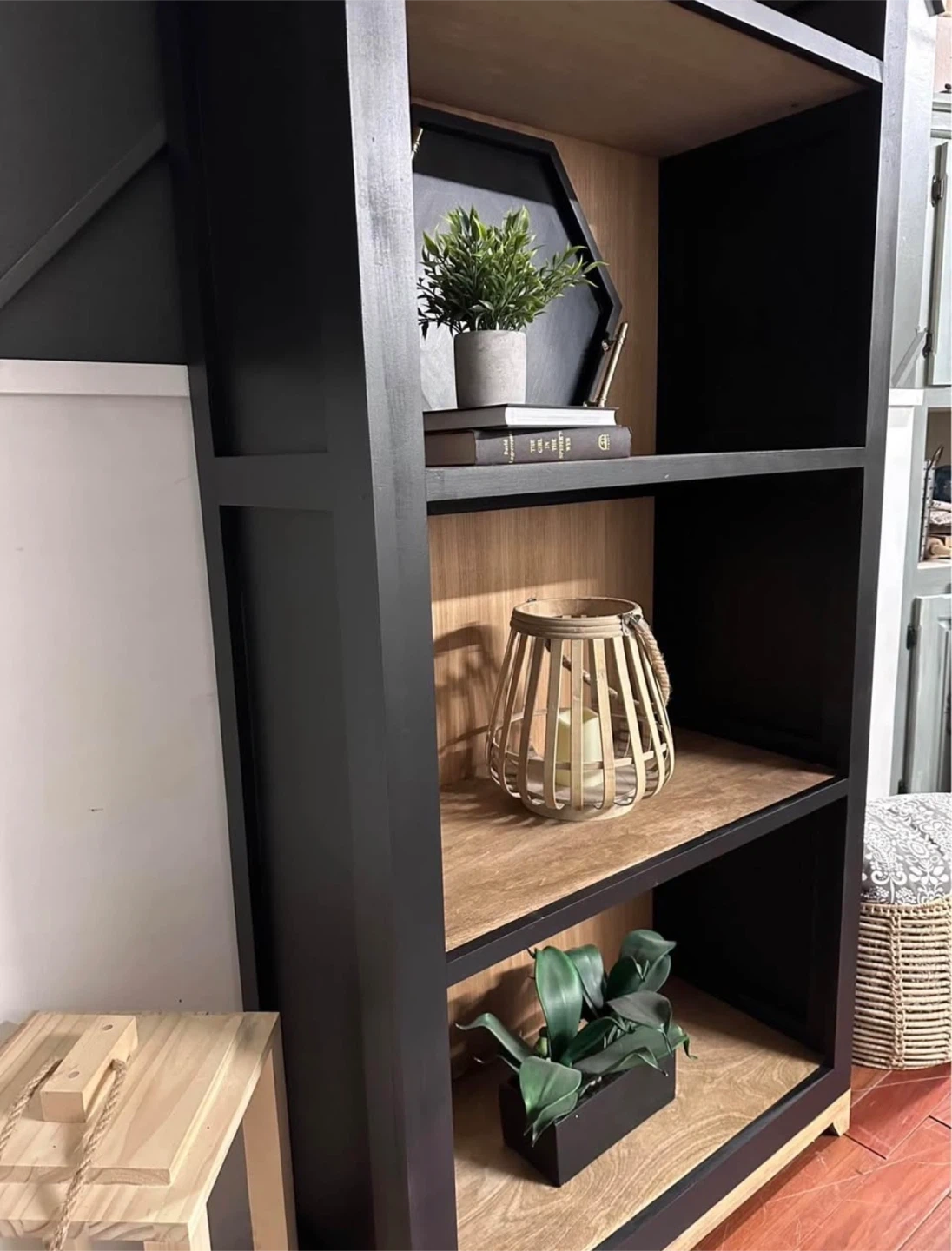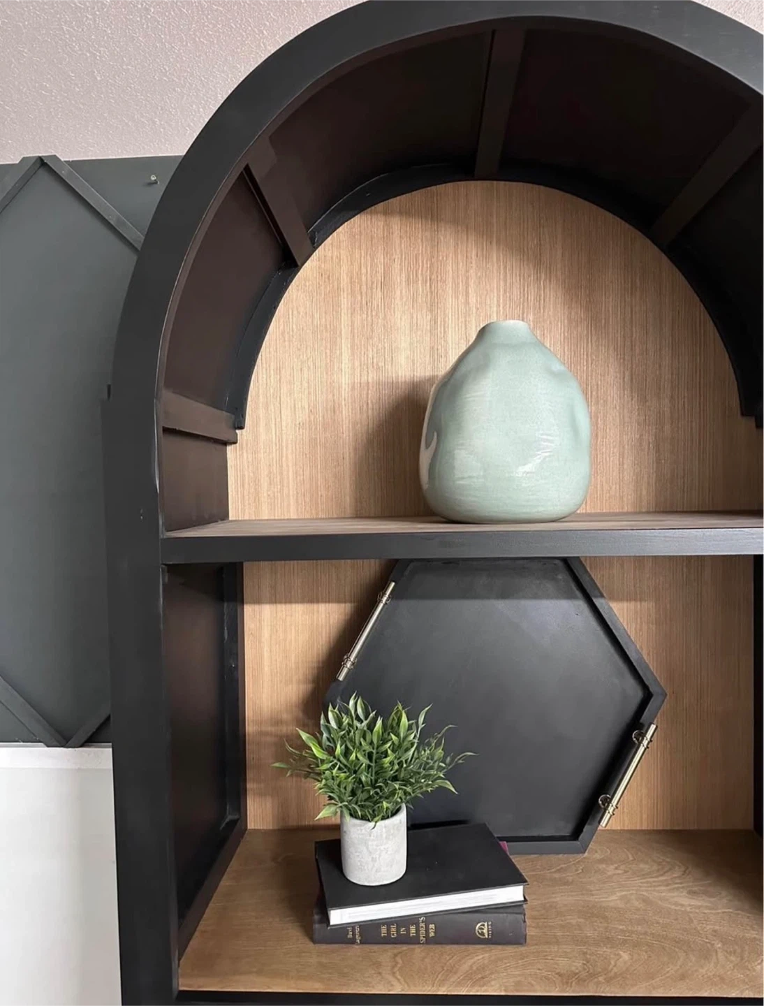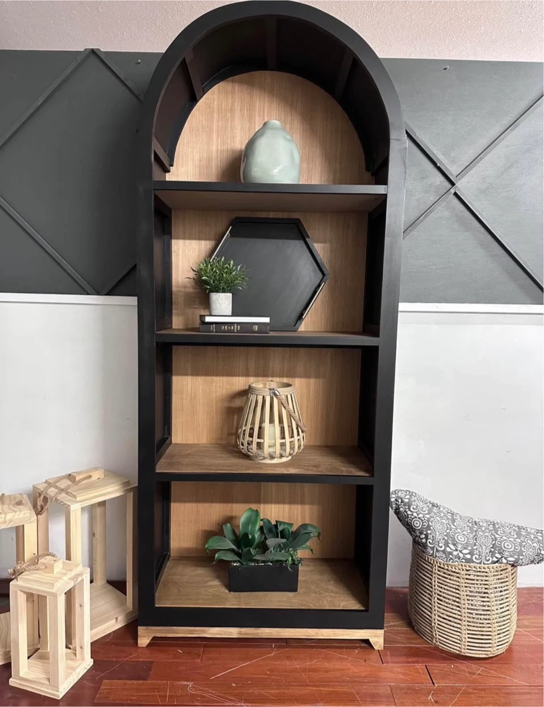 This black arched bookcase features five spacious wood-finished shelves. Its unique arch top adds a stylish touch. It's perfect for displaying books, decor, or plants.
