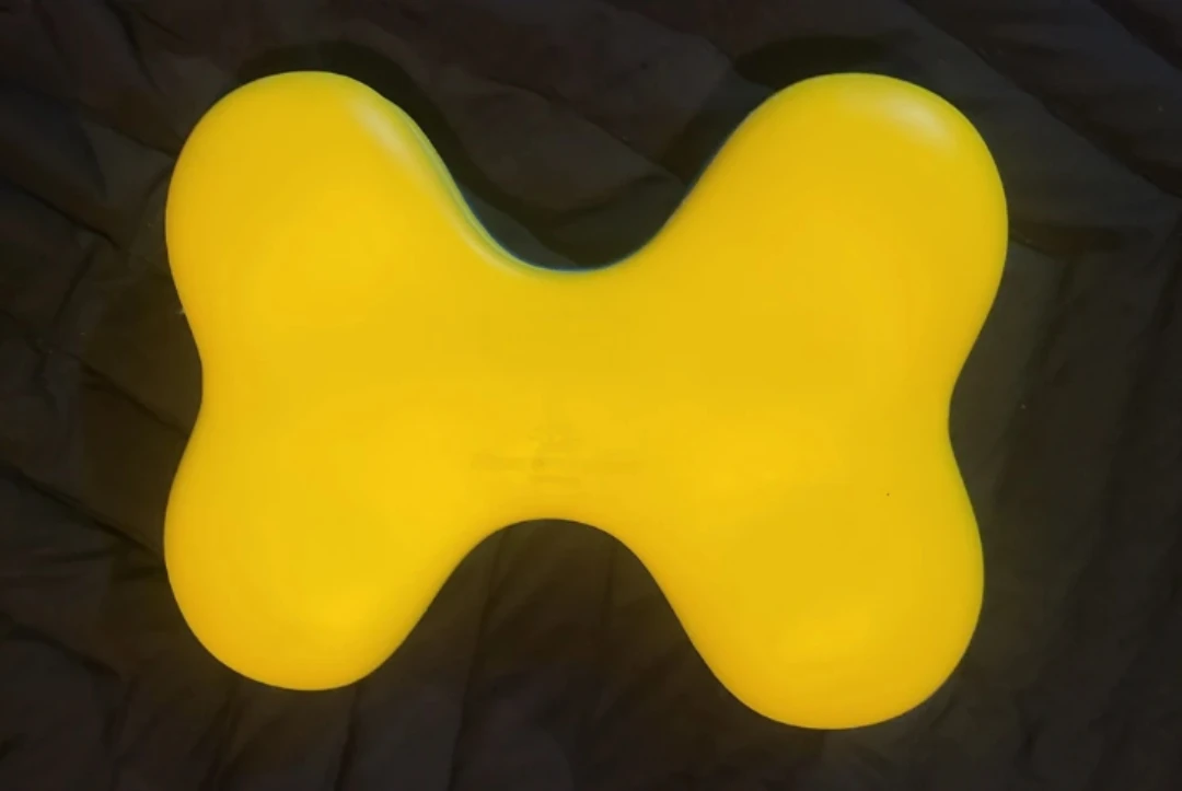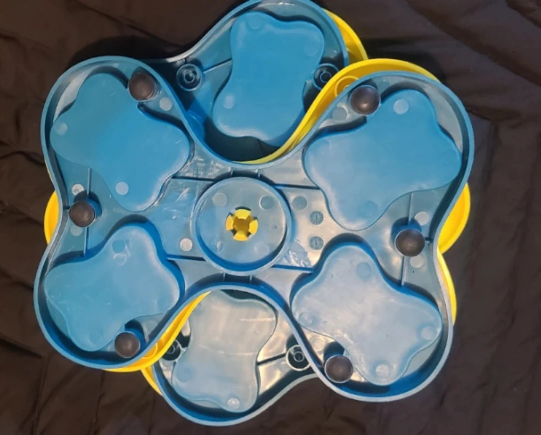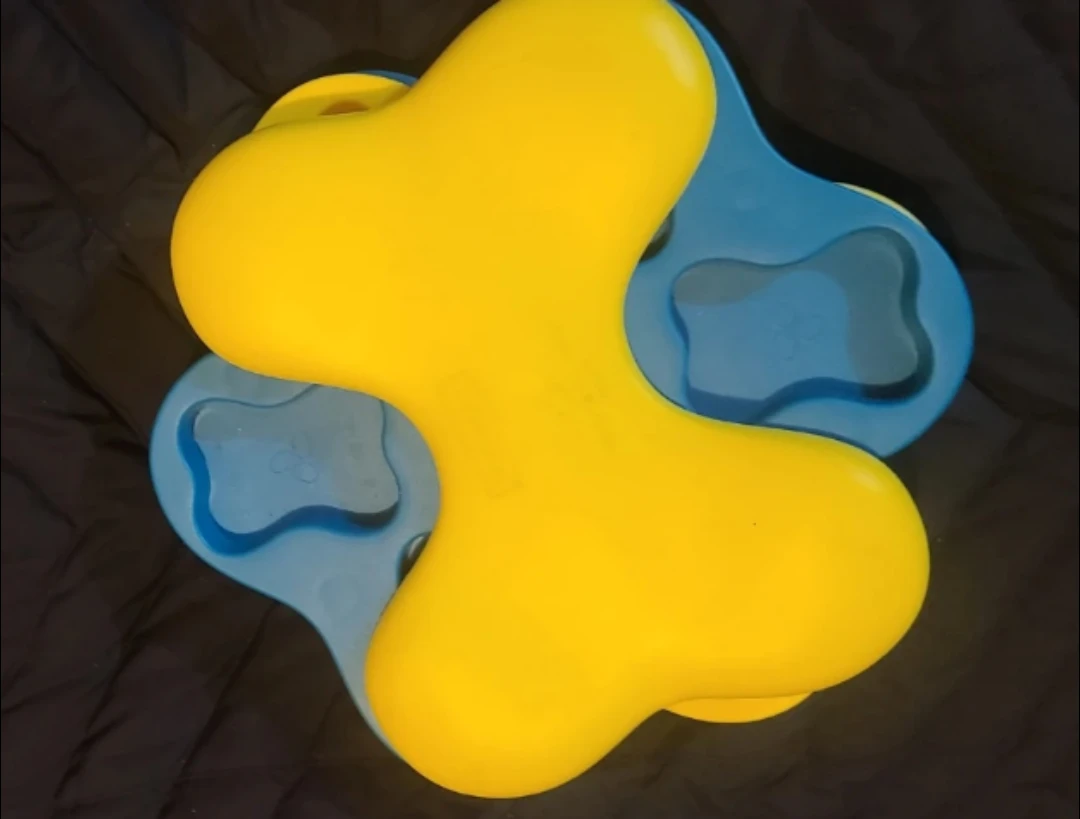 Yellow and blue interactive dog puzzle feeder toy. It has multiple compartments to hide treats. This toy is great for mental stimulation and slow feeding.