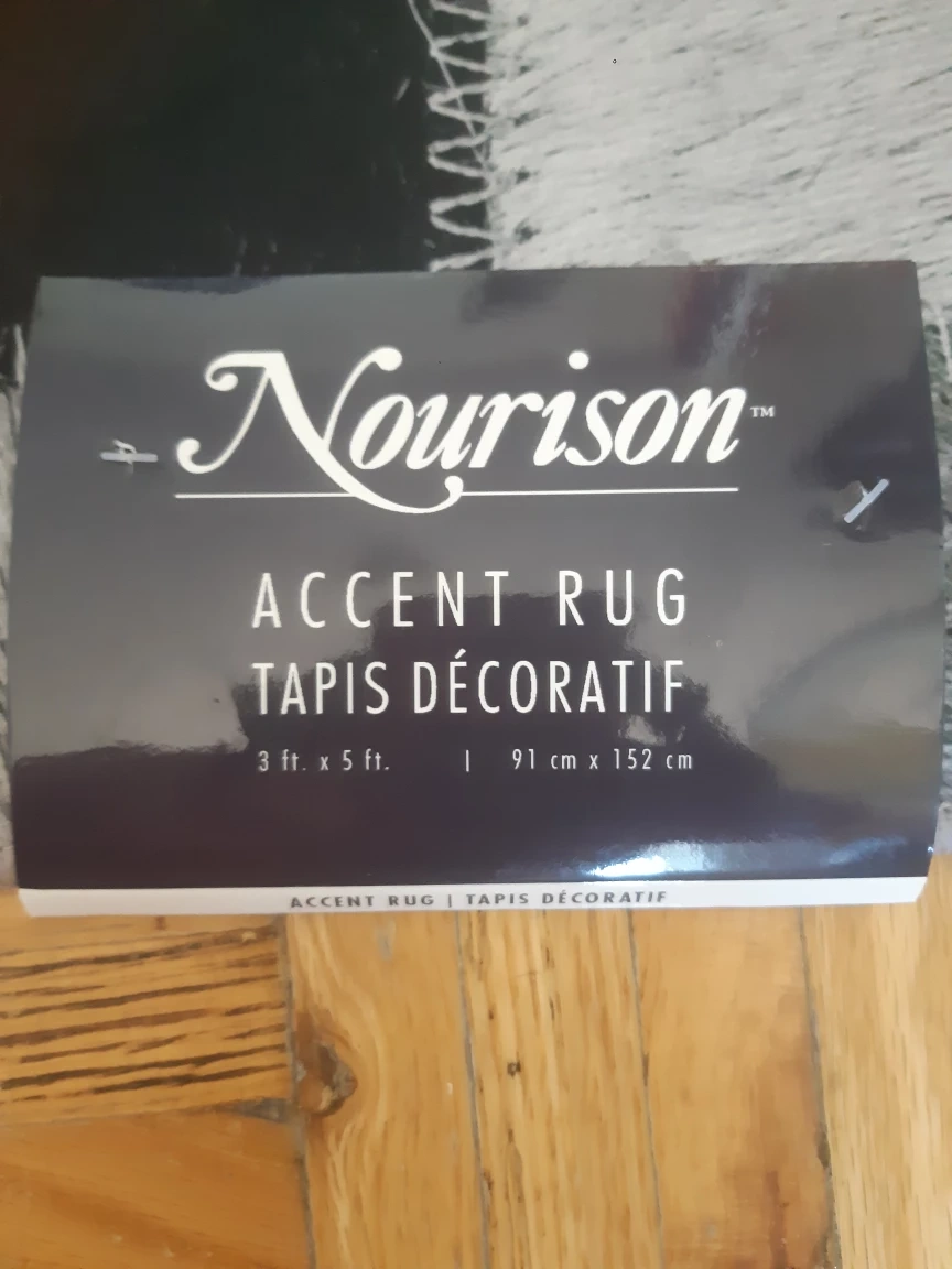 Selling a Nourison accent rug that's in great shape! It measures 3 ft x 5 ft (91 cm x 152 cm). The design is a cool patchwork style with black, grey, and white tones. It would look great in any room!