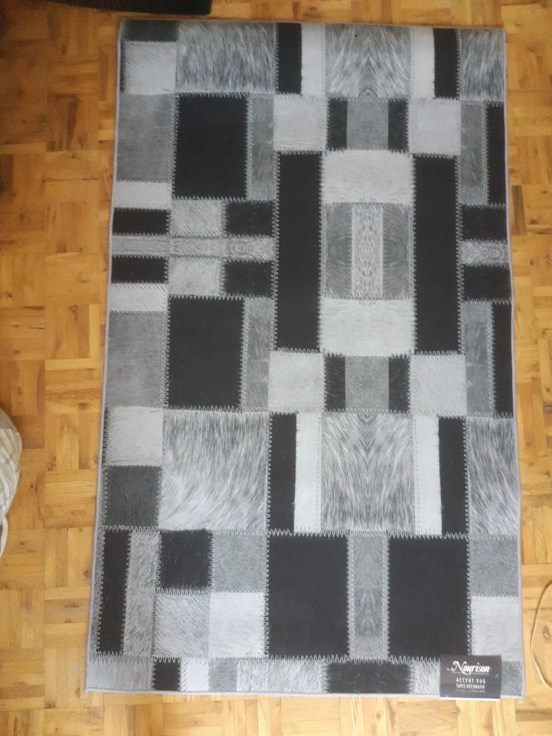 Selling a Nourison accent rug that's in great shape! It measures 3 ft x 5 ft (91 cm x 152 cm). The design is a cool patchwork style with black, grey, and white tones. It would look great in any room!