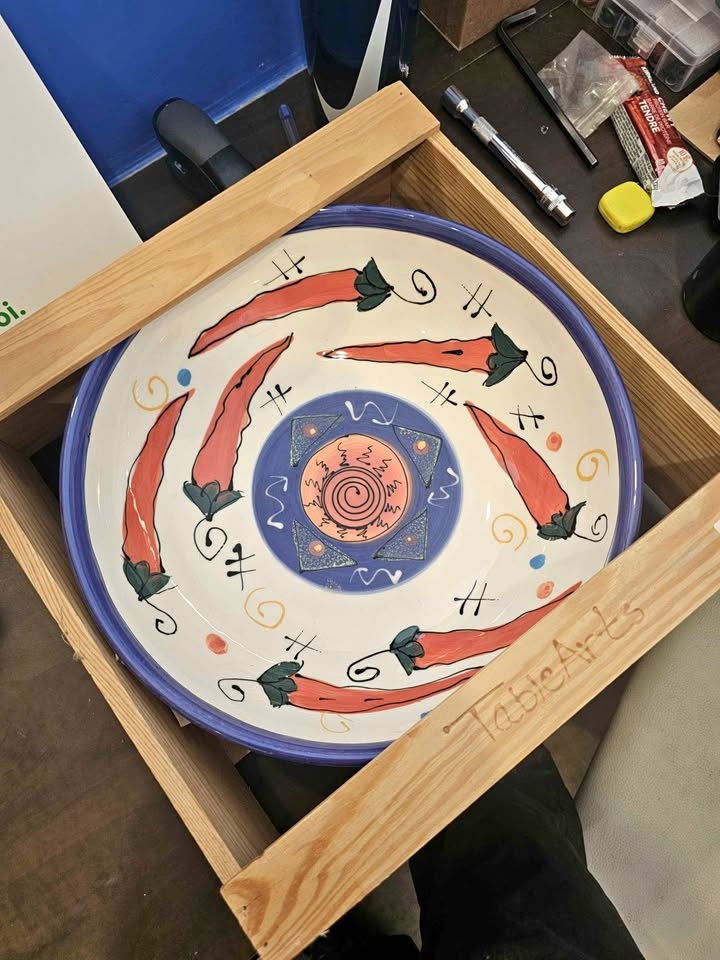 Hand-painted decorative ceramic bowl with wooden frame. Nice chili pepper design. Diameter: about 30 cm. Great for decoration or serving.