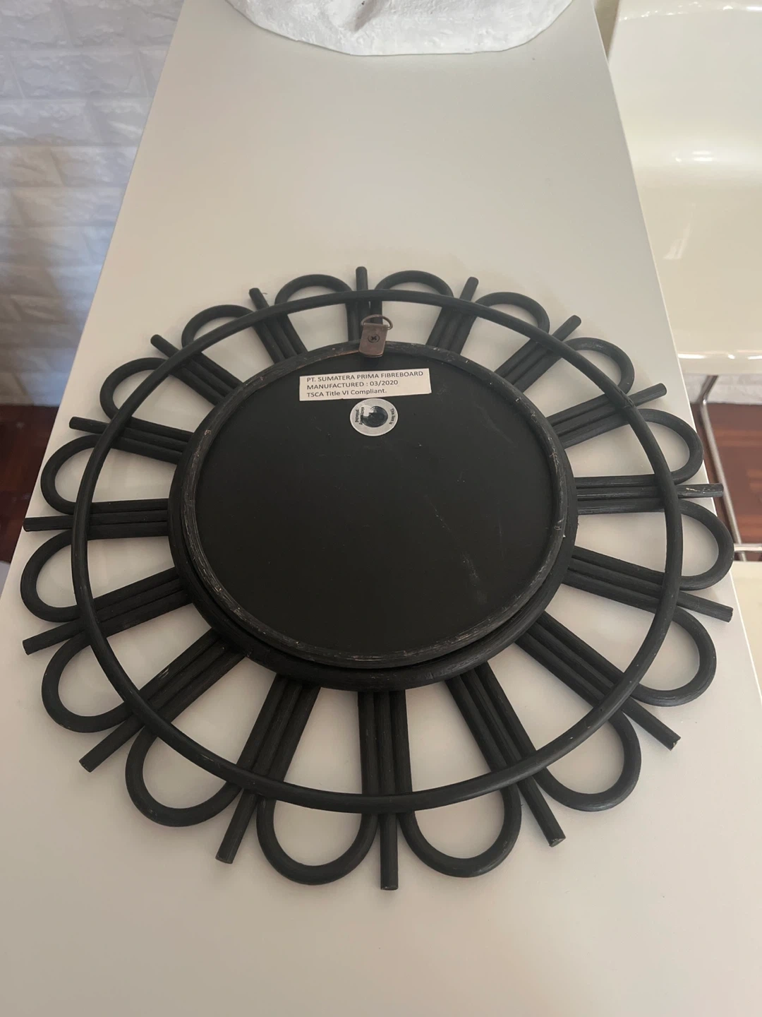 This black rattan sunburst mirror adds a decorative touch to any room. It features a unique sunburst design with a mirrored center. Ready to hang with a circular loop on the back.