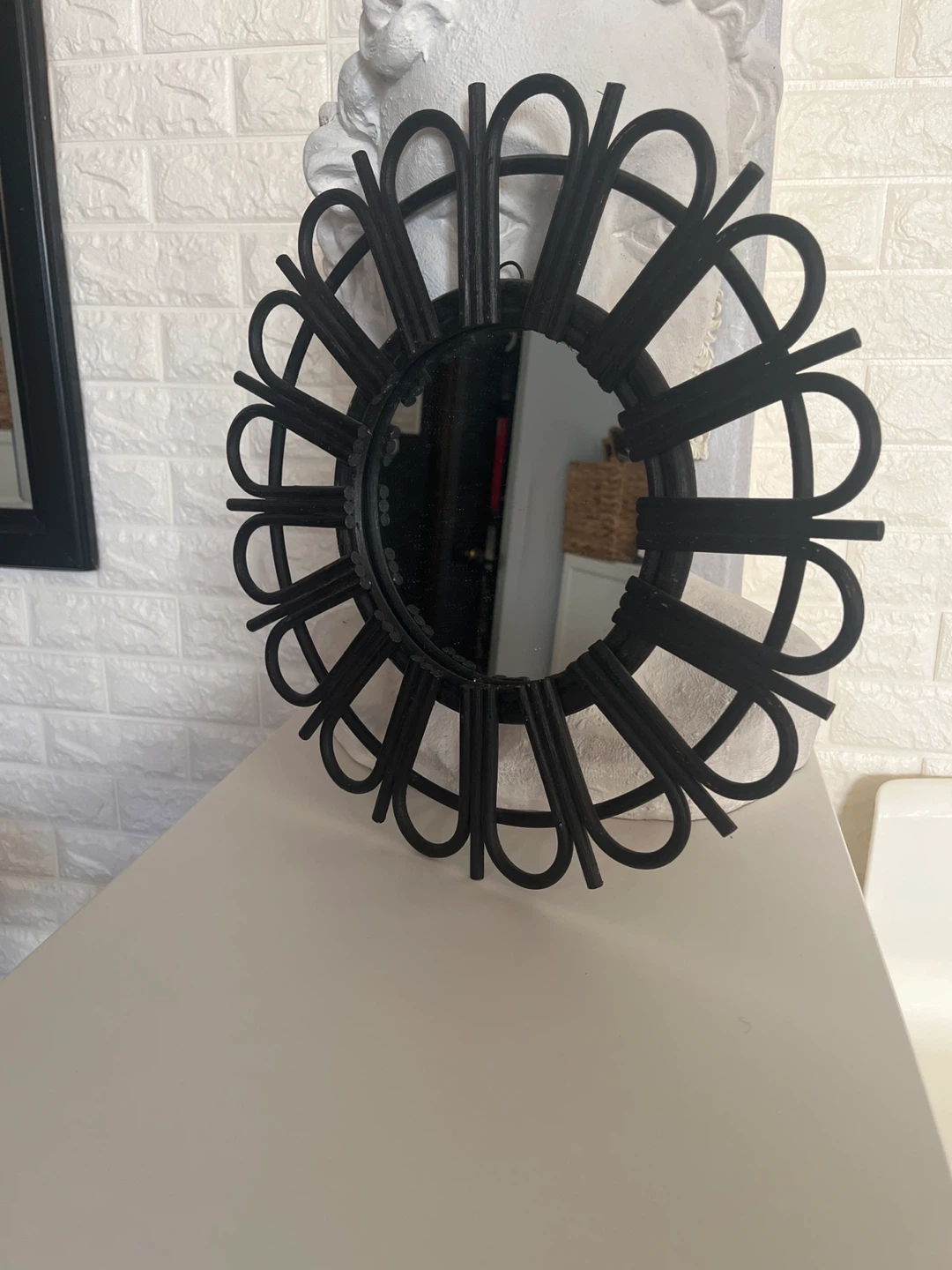 This black rattan sunburst mirror adds a decorative touch to any room. It features a unique sunburst design with a mirrored center. Ready to hang with a circular loop on the back.