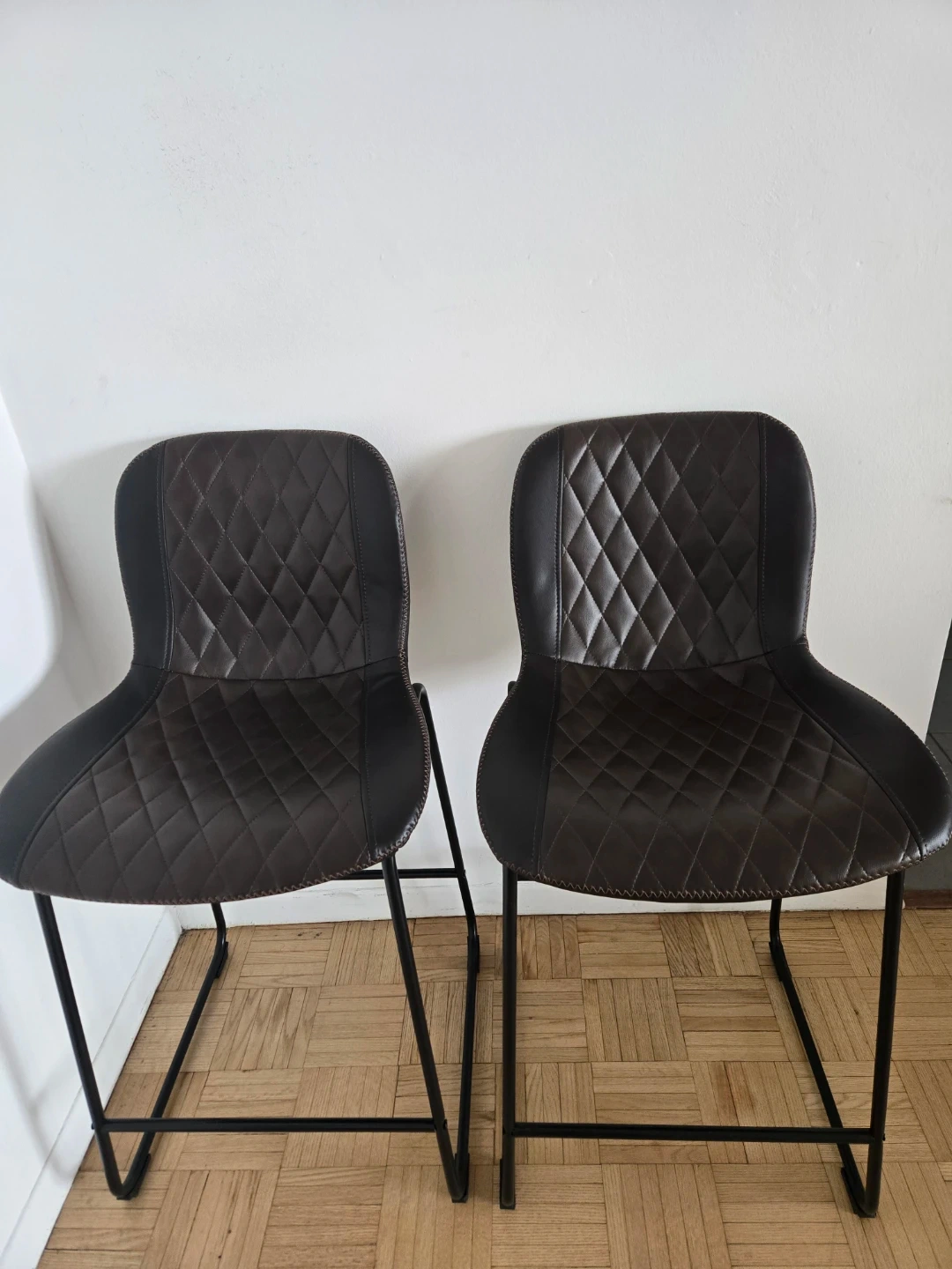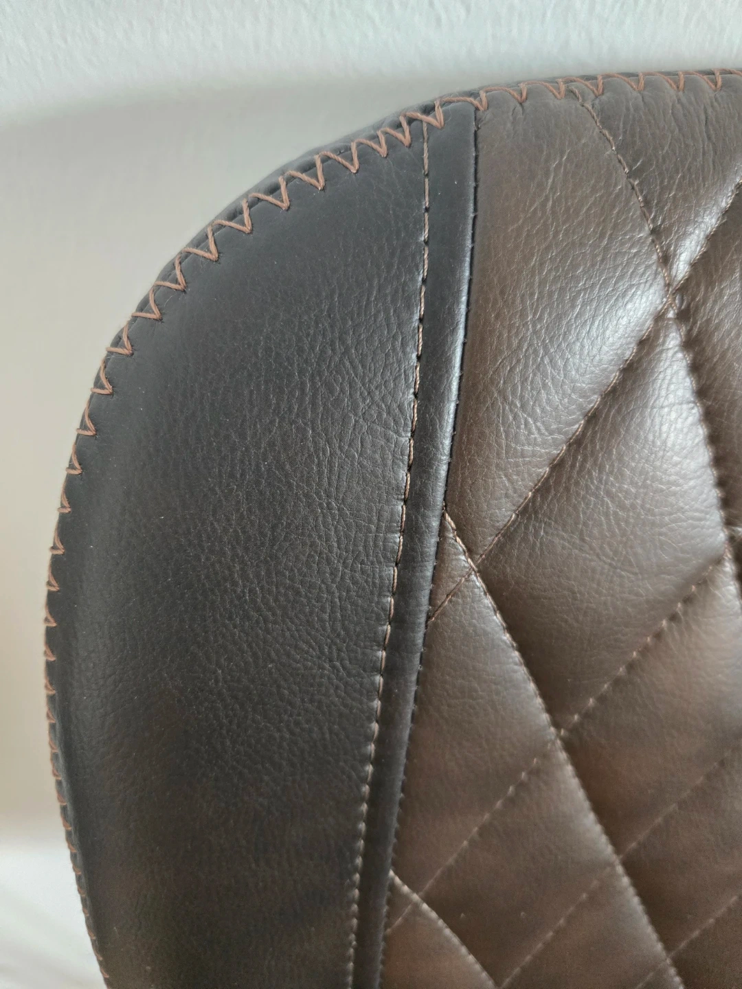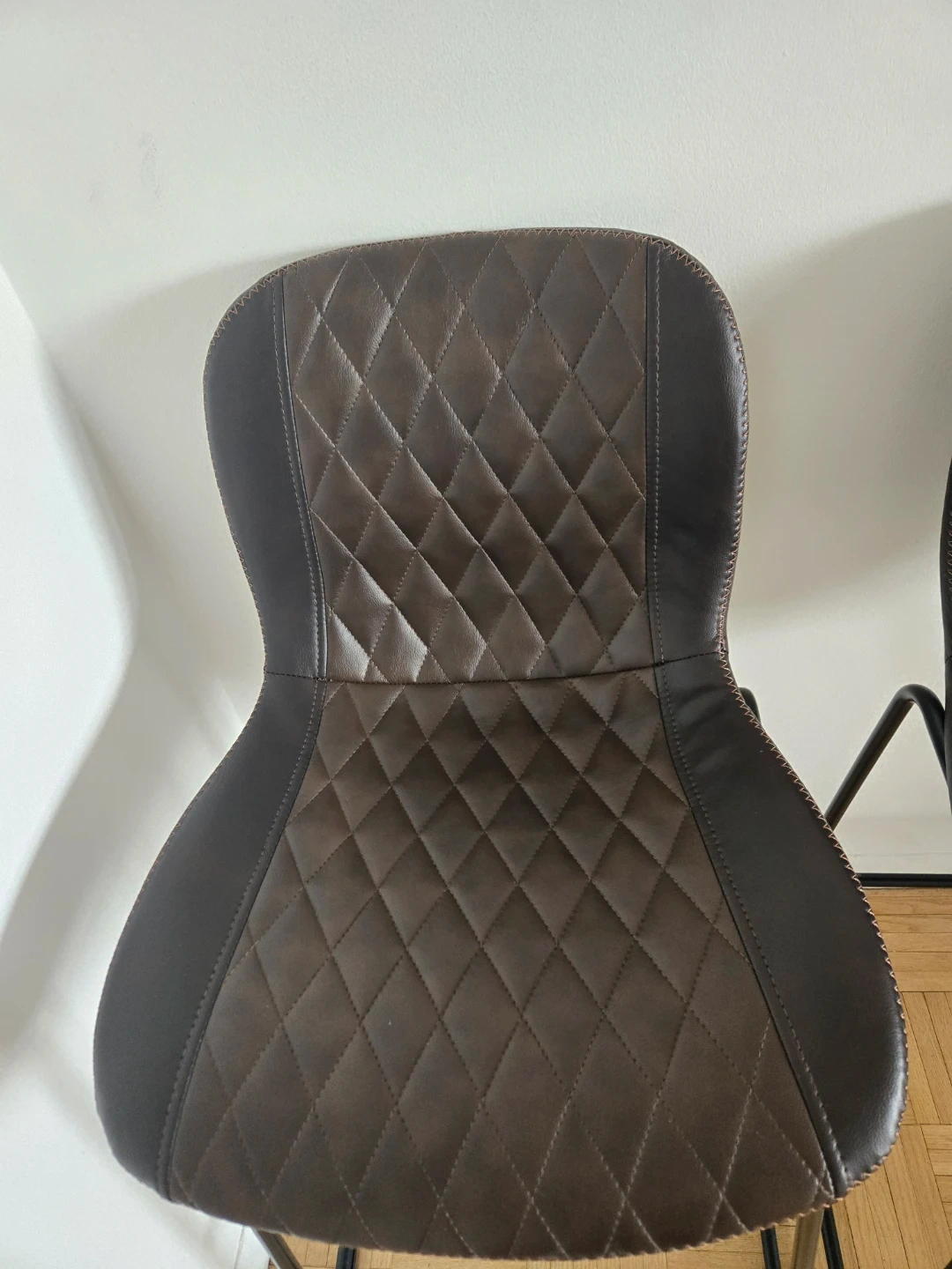 Stylish bar stools featuring a diamond-stitched seat and back. Upholstered in brown faux leather with contrasting dark brown sides and detailed stitching. These stools are perfect for adding a touch of modern flair to your kitchen counter or home bar.