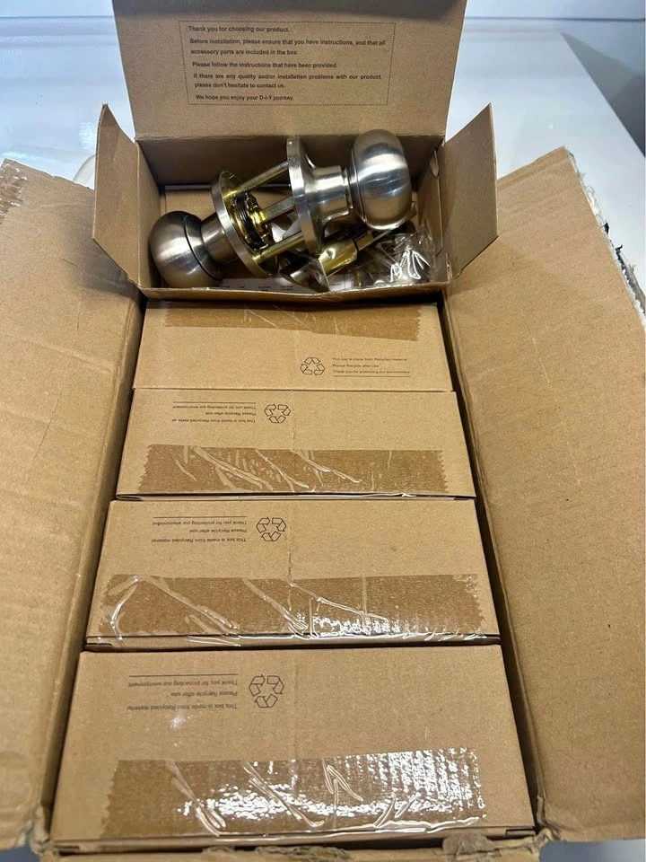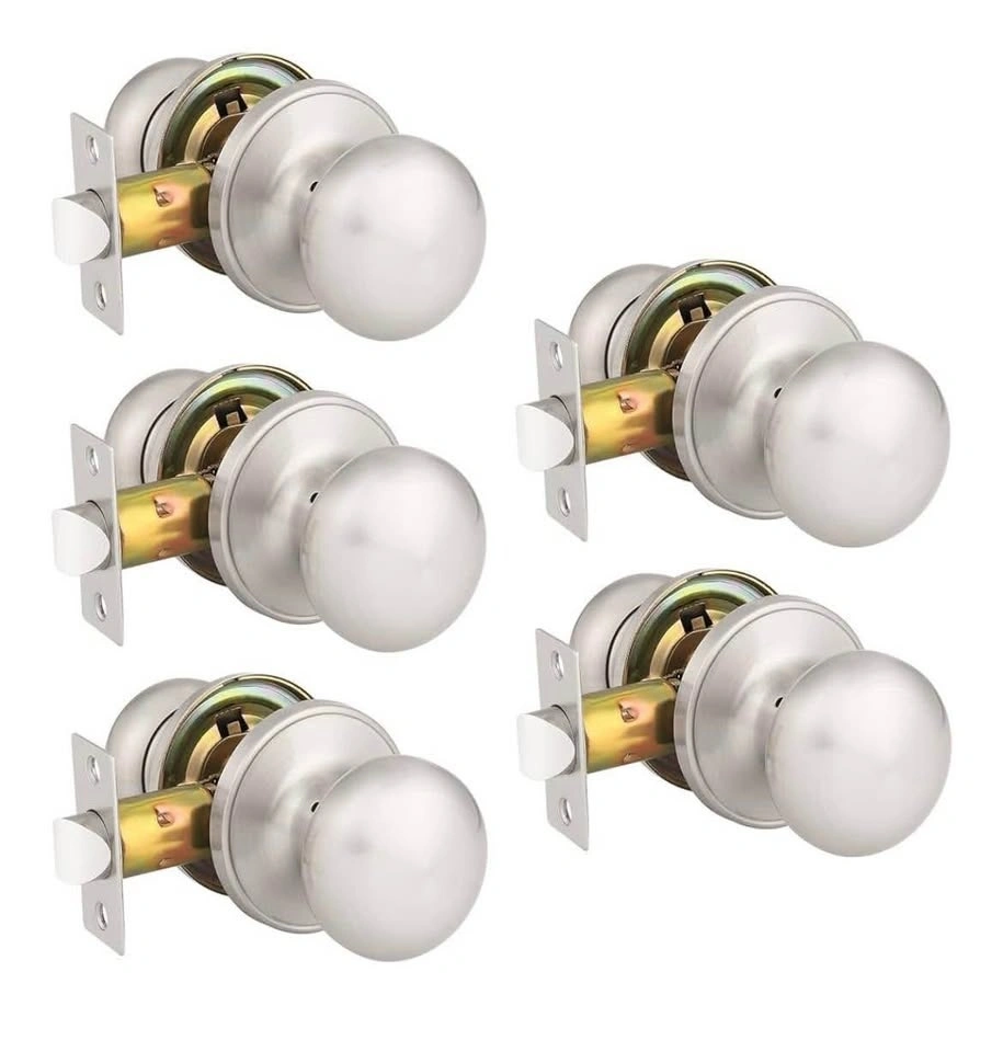 New GOBEKOR 5 Pack Brushed stainless steel door knobs. Passage function, suitable for hall and closet doors. Non-locking, round ball design with a colonial style. These handles work for left and right-hand doors. Pick up near Bloor and Dixie in Mississauga.