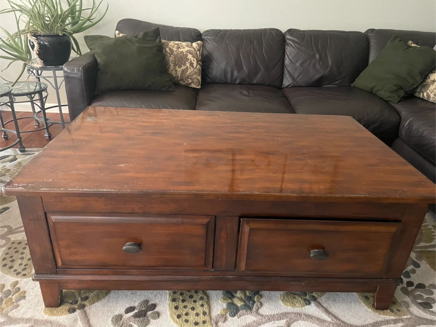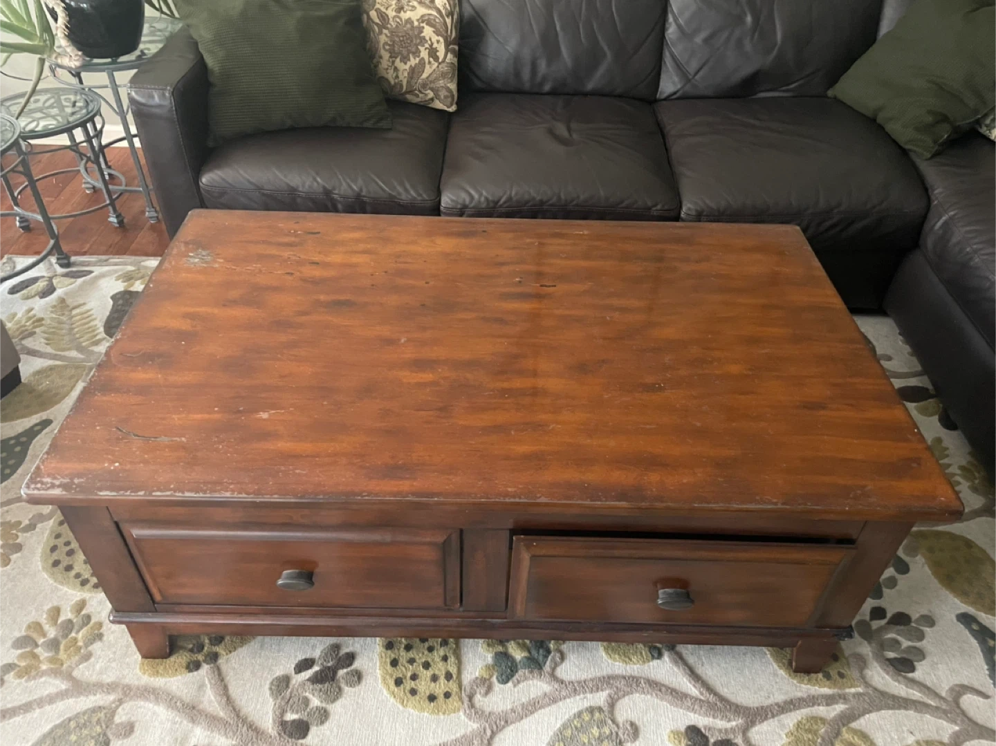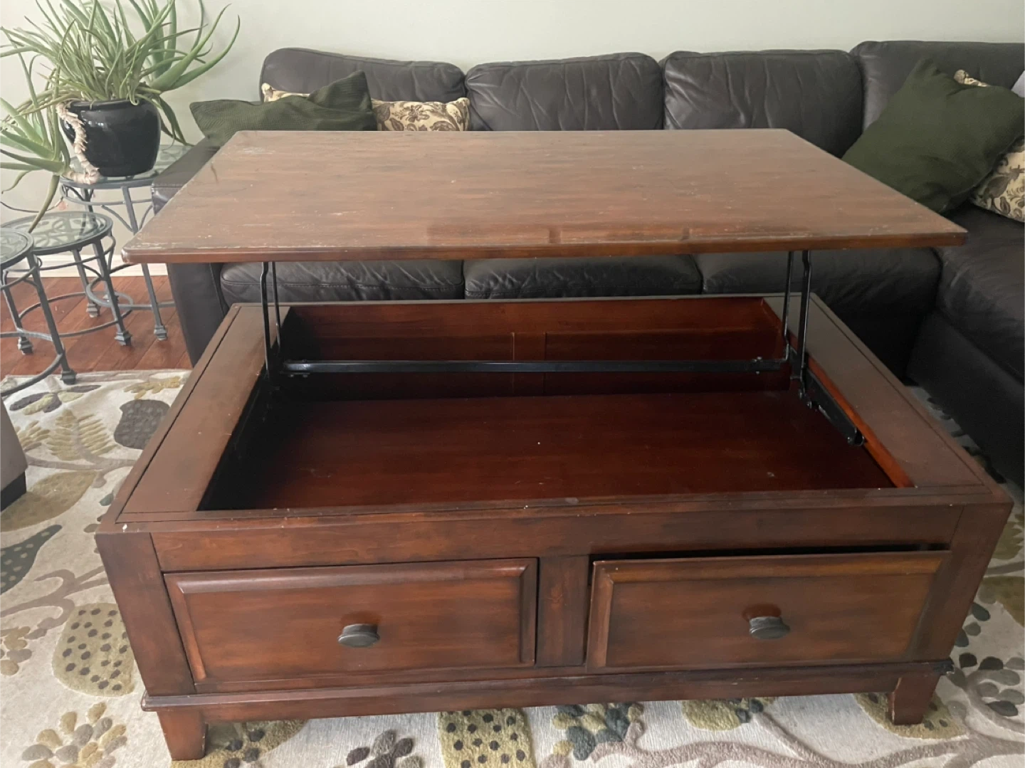 This wooden coffee table features two storage drawers and a lift-top mechanism for extra space. It's a handy piece for keeping your living room tidy. The dark wood finish complements most decor styles. This table is great for holding remotes, coasters, or magazines, and the lift top is useful for eating or working.