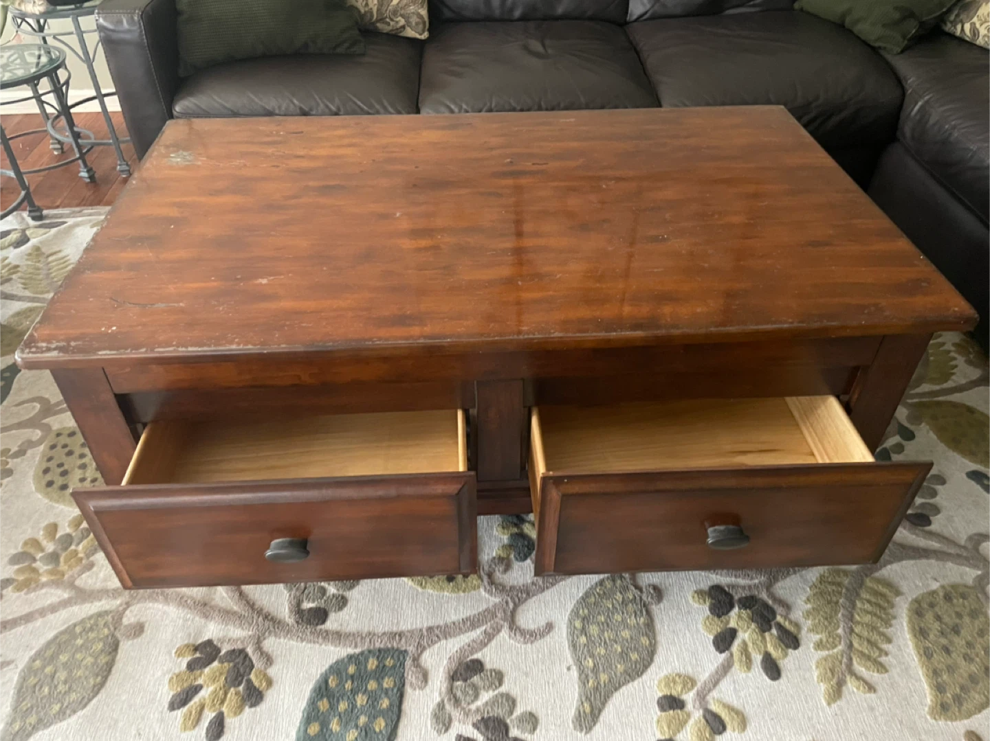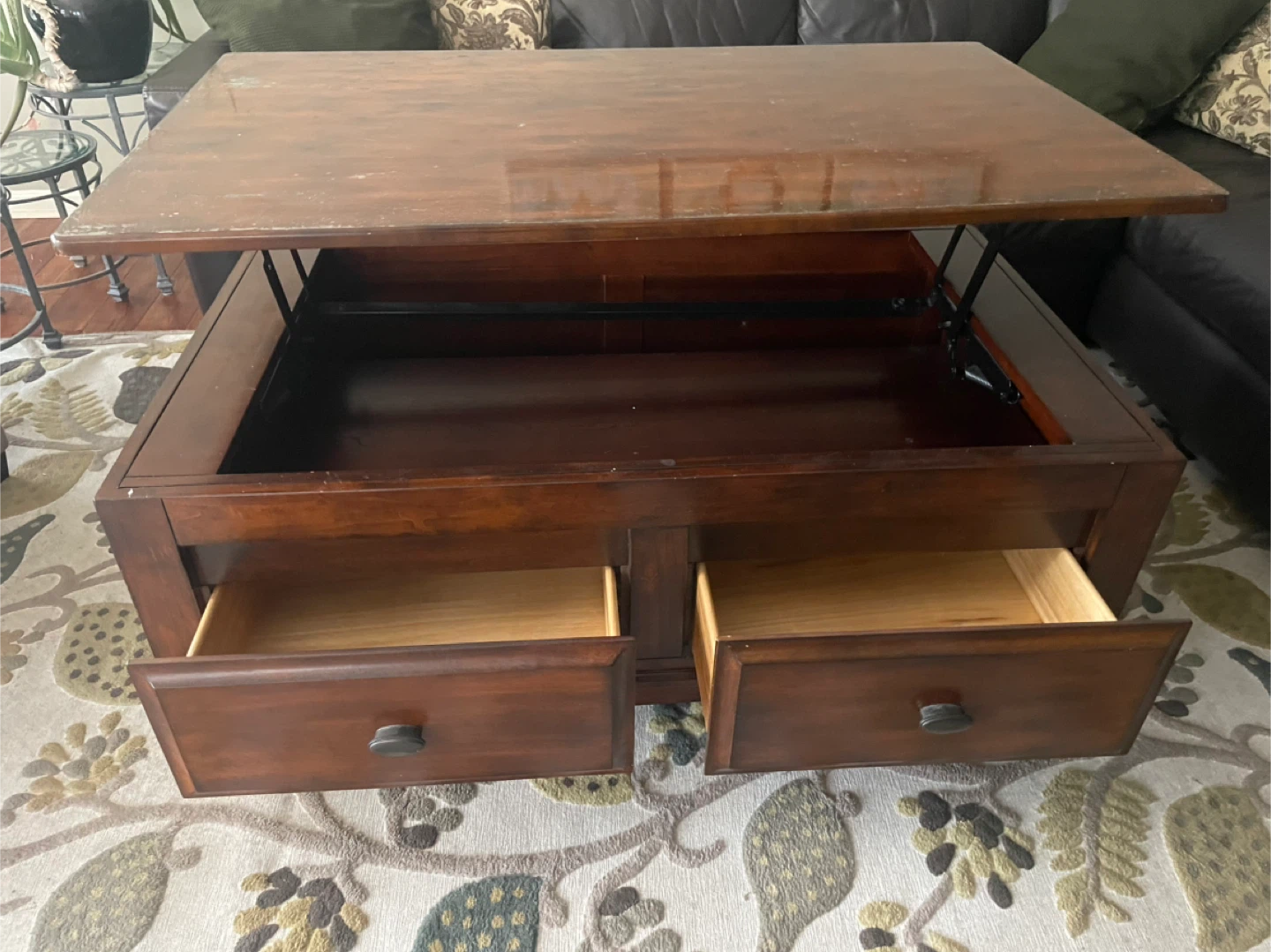 This wooden coffee table features two storage drawers and a lift-top mechanism for extra space. It's a handy piece for keeping your living room tidy. The dark wood finish complements most decor styles. This table is great for holding remotes, coasters, or magazines, and the lift top is useful for eating or working.