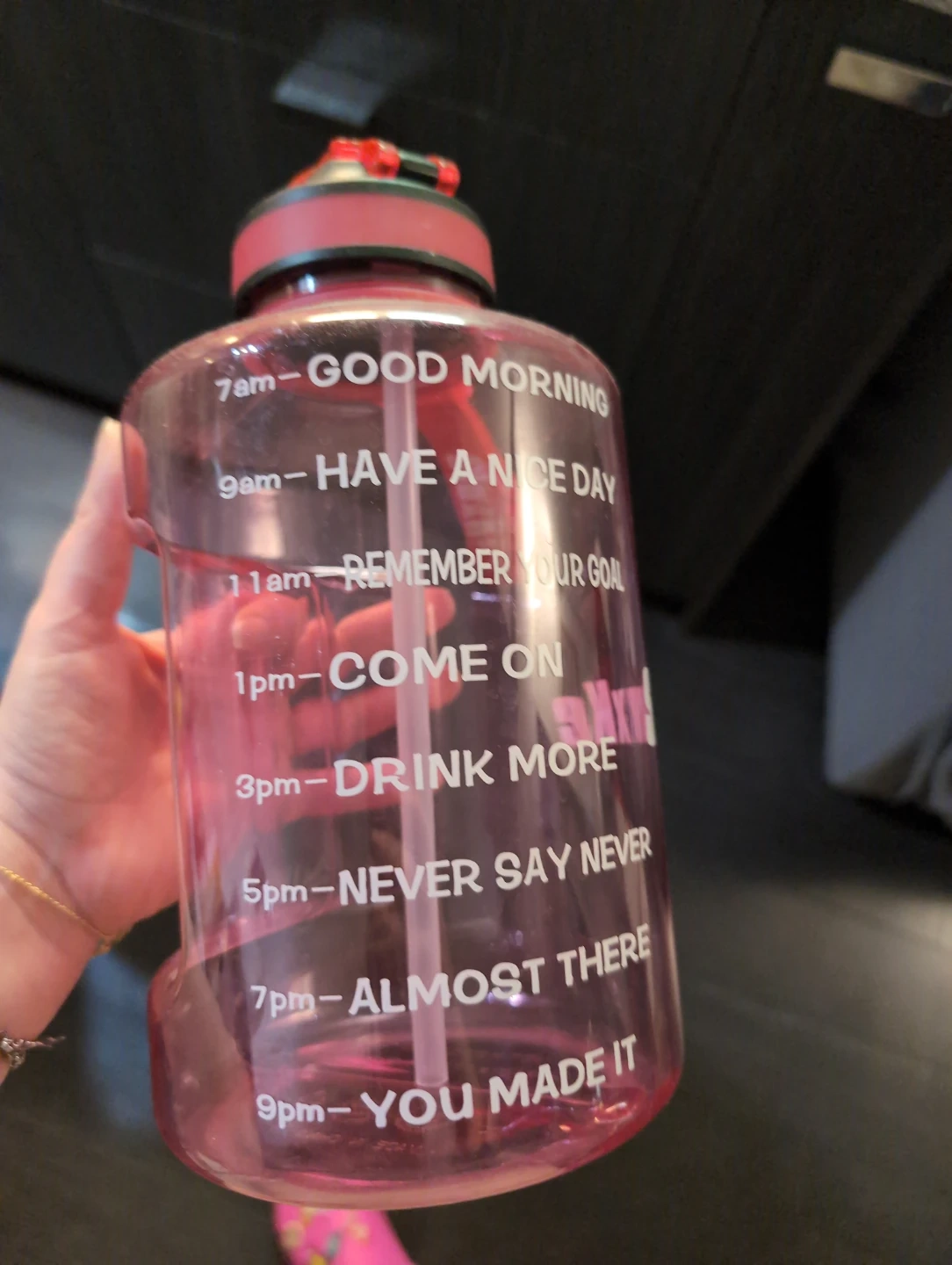 This is a large pink water bottle with motivational time markings. It has a straw for easy drinking. This bottle is great for staying hydrated throughout the day!