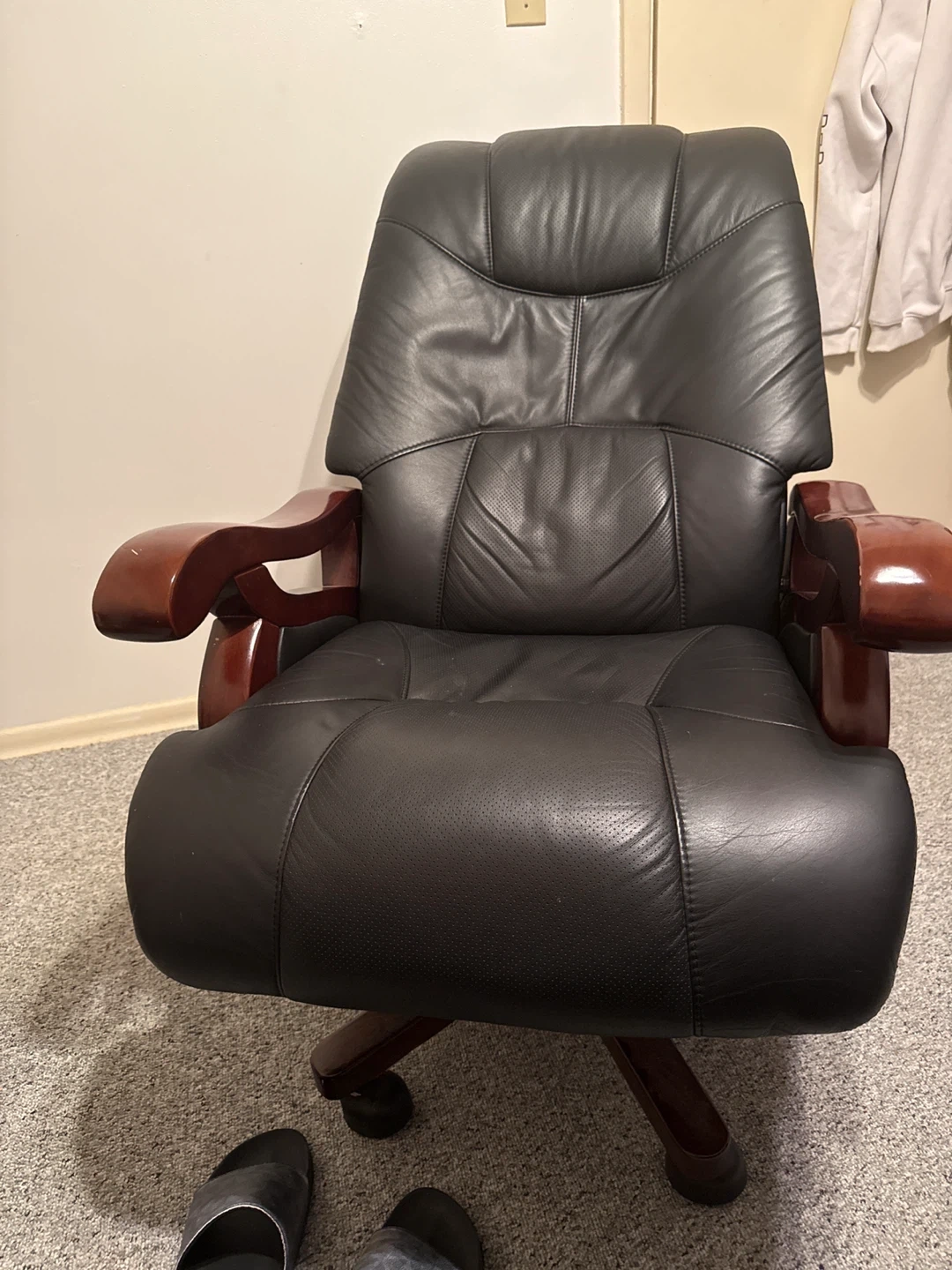 This is a black leather executive office chair with wooden accents. It features a high back and padded armrests for comfort. Some wear is visible on the armrests. This chair is designed for prolonged sitting.