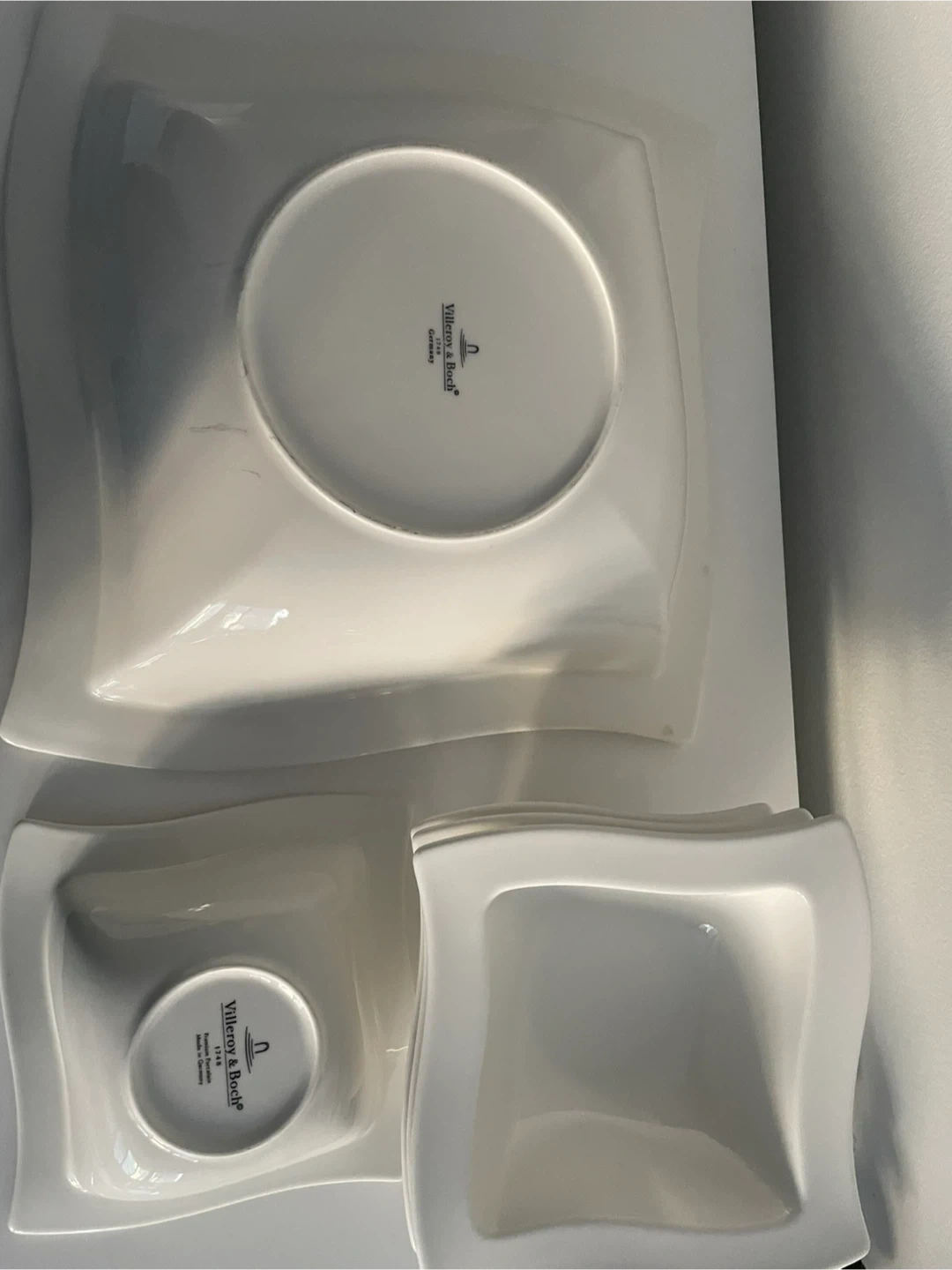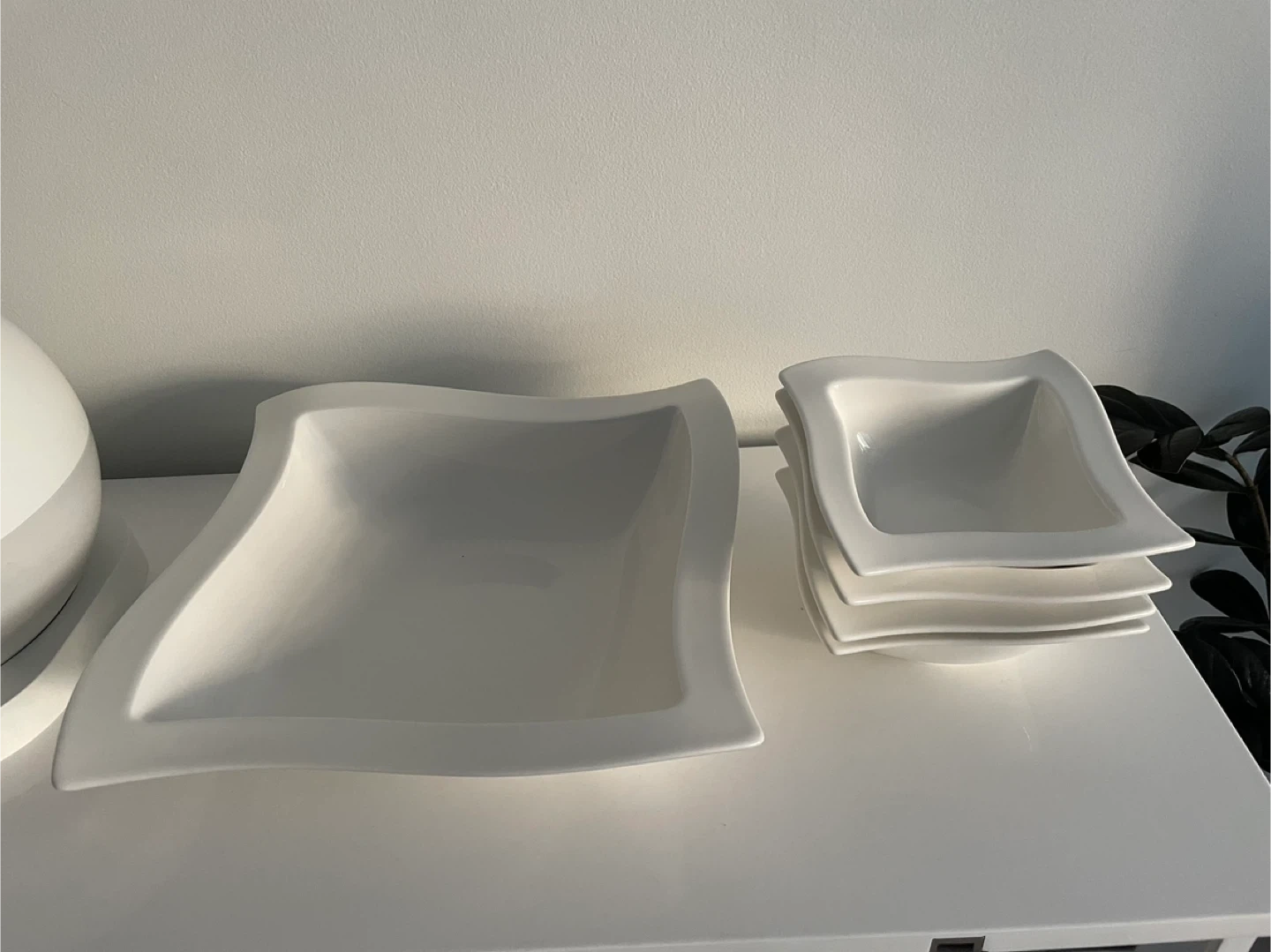 This set includes one large square serving bowl and a stack of four smaller square bowls. Not pictured - a coffee mug to go with it