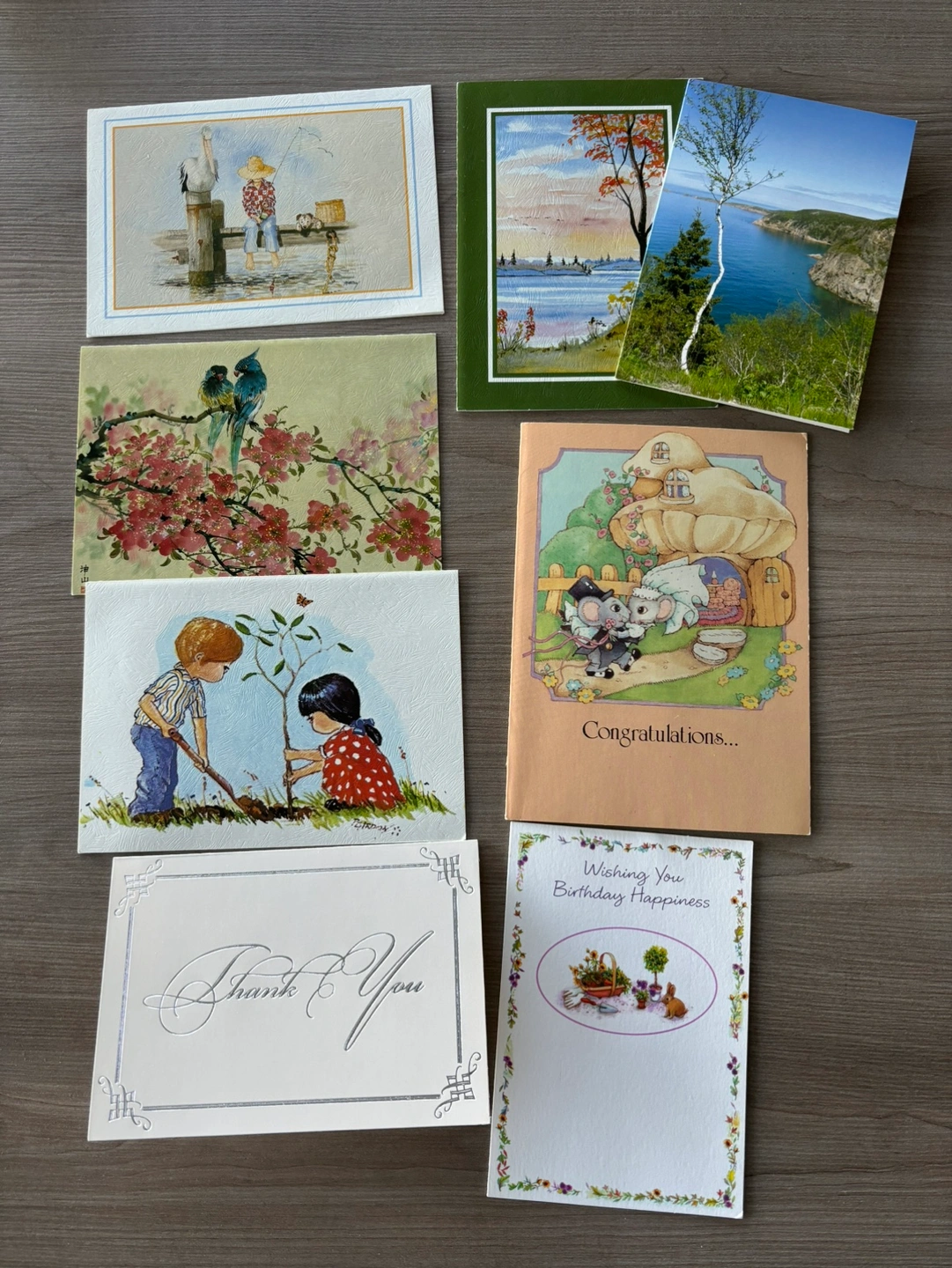 Set of 8 greeting cards. Includes a thank you card, a congratulations card, a birthday card, a valentine card and 5 beautiful or unique blank cards and their envelopes.