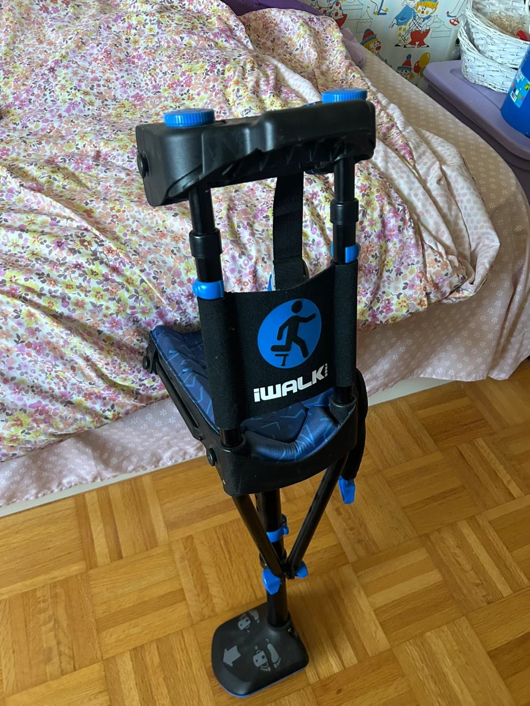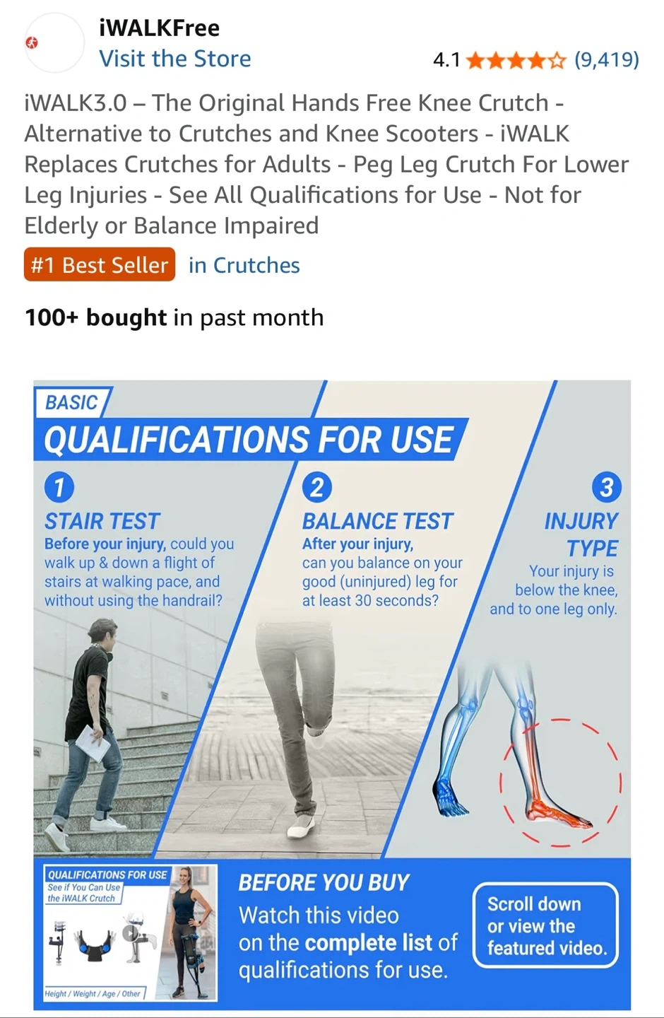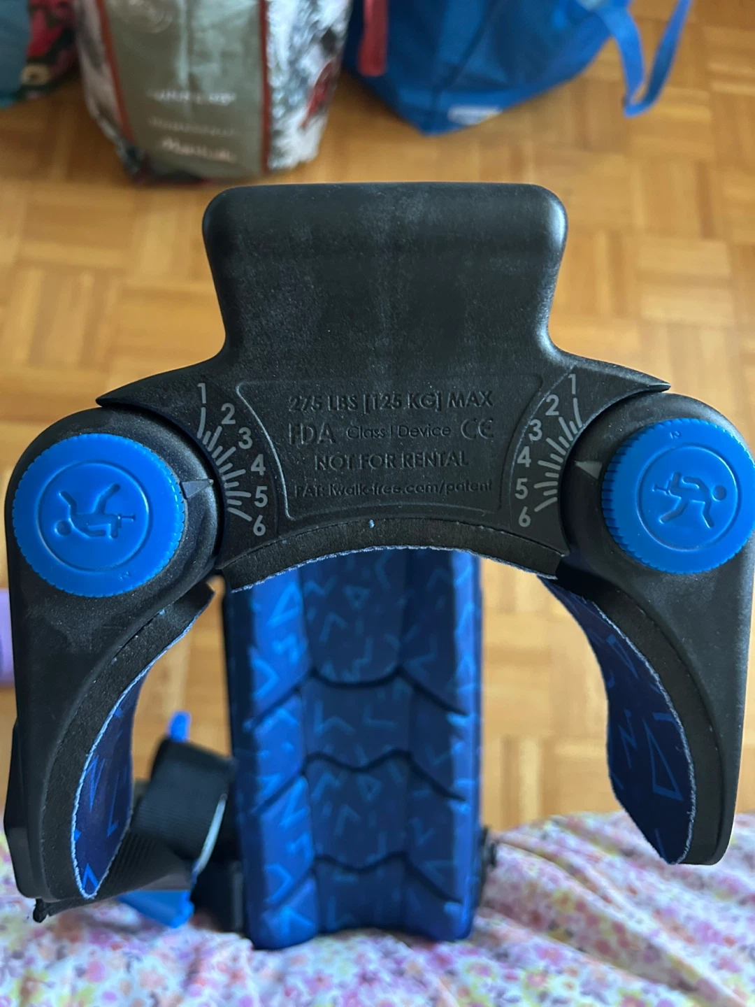 This iWALK 3.0 is a hands-free crutch alternative designed for users with lower leg injuries. It's adjustable and made for comfort during recovery. Maximum weight capacity is 275 lbs (125 kg).
